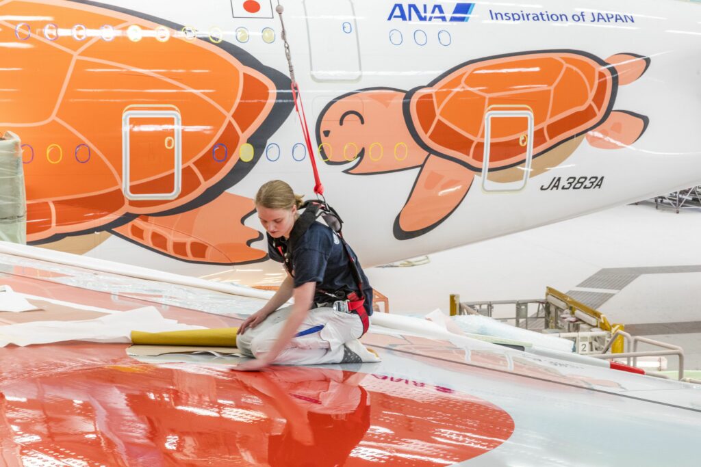 De Airbussen van ANA worden gekenmerkt door de bijzondere kleurenstelling met de print van een enorme zeeschildpad. ANA schreef destijds een wedstrijd uit voor het design van het vliegtuig dat ze in 2019 in haar vloot ging verwelkomen. Uit bijna 2.200 inzendingen werd het ontwerp van Chihiro Masuoka gekozen. De selectie was gebaseerd op de eindbestemming van de A380, Hawaï waar een groene zeeschildpad, ‘Honu’ in de Hawaiiaanse taal, symbool staat voor geluk en voorspoed.