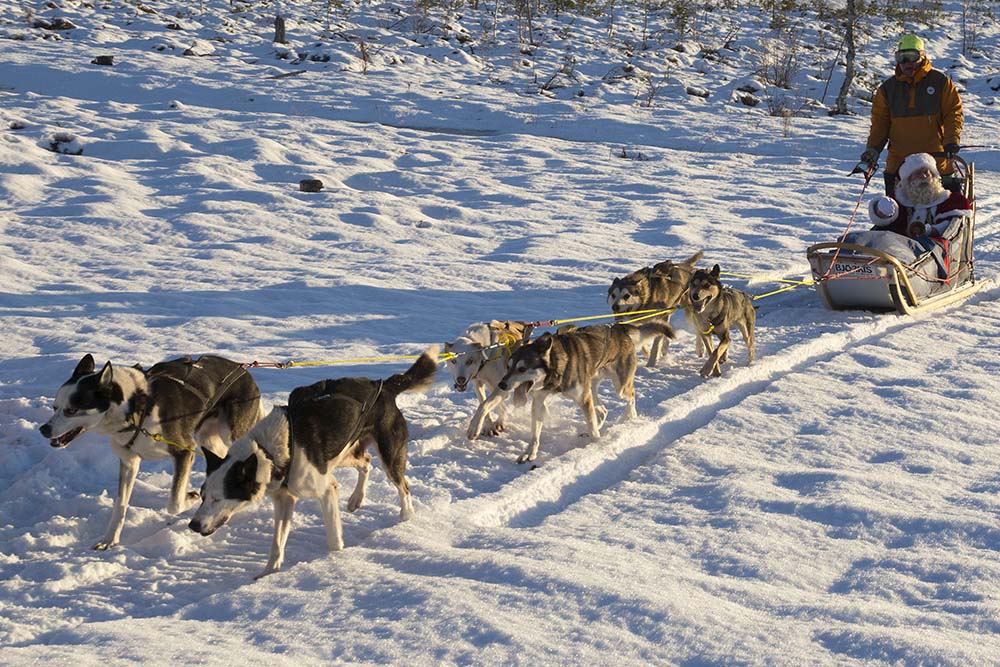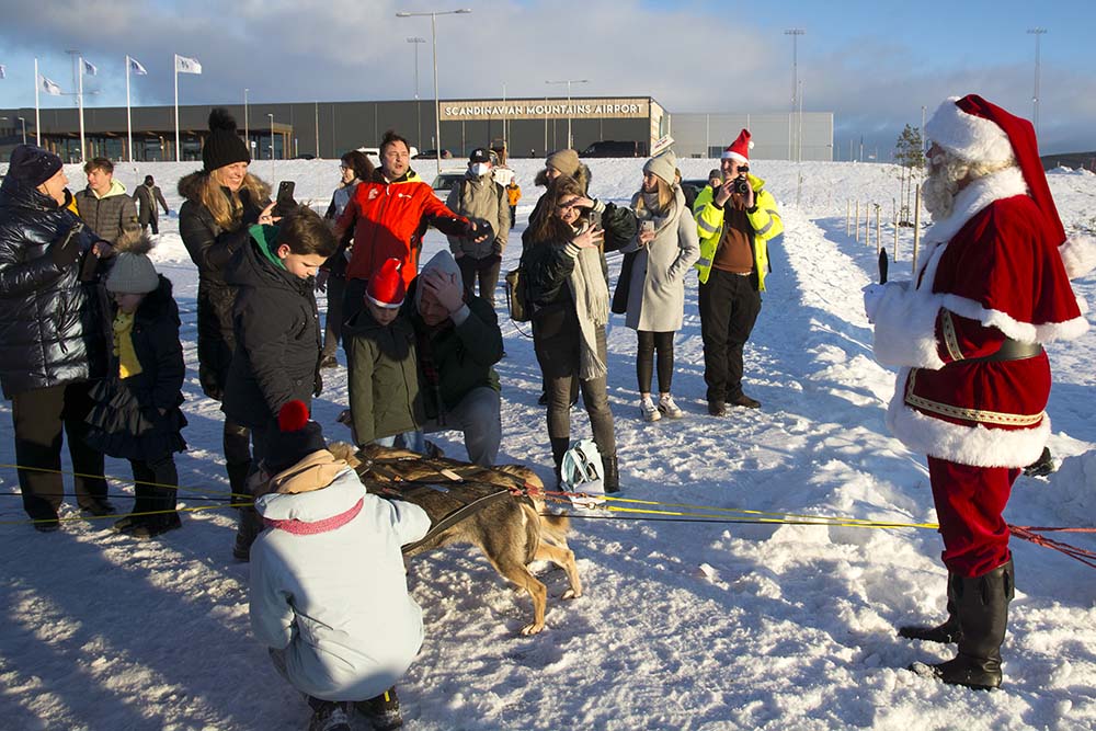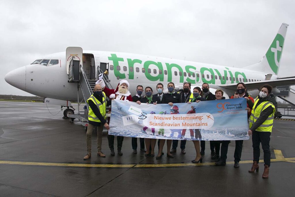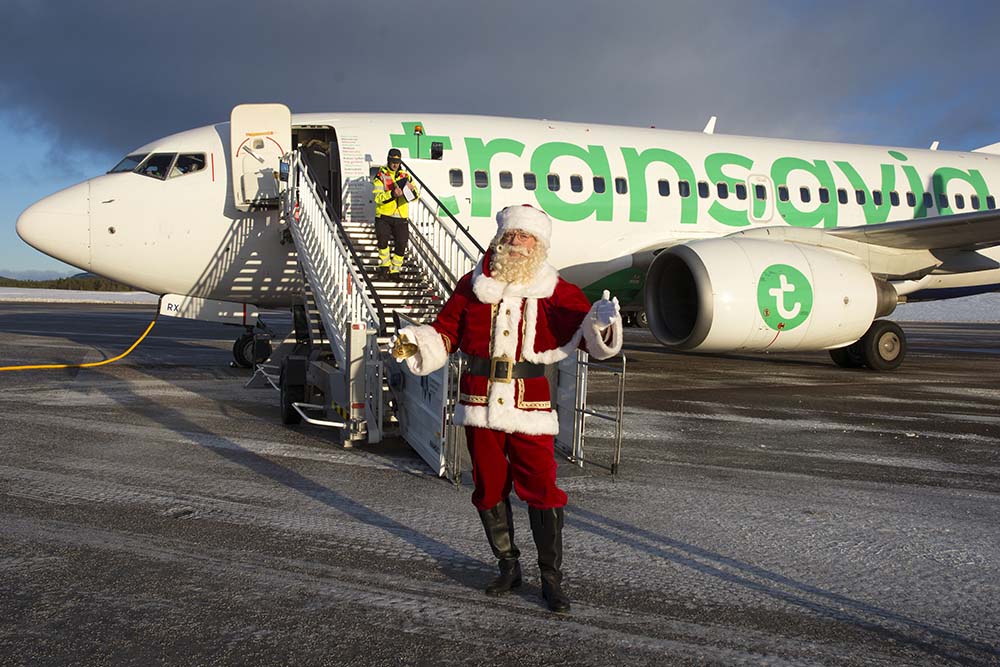 Omdat een eerste vlucht naar een nieuwe bestemming bijna nooit vol zit, bood BBI Tavel, een van de oudste reisorganisaties van ons land, kinderen (en hun ouders) de mogelijkheid om voor een vriendelijk prijsje de Kerstman op te halen. Dat werd een flitsende dagtrip. Vanaf het begin zat de stemming er goed in bij de 78 wintersporters en kids. Iedereen kreeg een fraaie kerstmuts en zuurstok. Na 90 minuten landde de Boeing 737-700 in Zweden. Het was zonnig, maar steenkoud door de harde wind. Bij de parkeerplaats van het vliegveld arriveerde de Kerstman in een slee, getrokken door husky’s. Iedereen kon met de goedgeluimde Kerstman op de foto. Ook de Transavia-stewardessen maakten daar maar wat graag gebruik van. Op de terugreis was er gelegenheid om een praatje met hem te maken. Na een rustig verlopen vlucht landde het toestel rond 14.15 uur weer op Groningen Airport Eelde. Men kan daar terugkijken op een geslaagde drievoudige primeur.