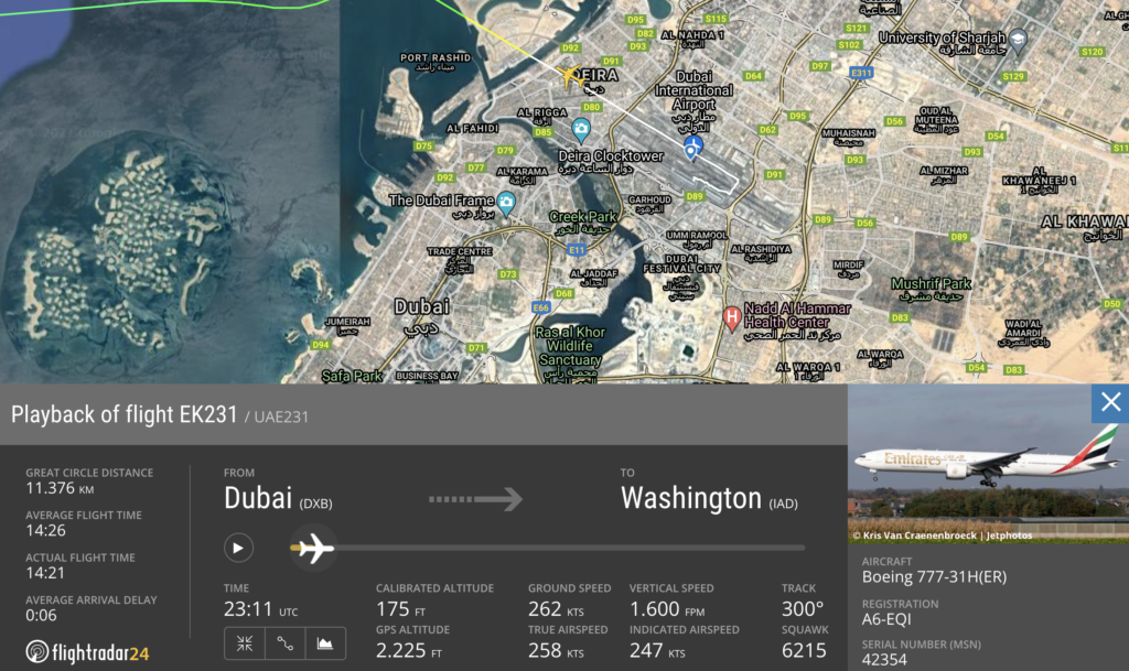 Toen het toestel vanuit Dubai vertrok reed het met 216 knopen op de grond. Met diezelfde snelheid steeg het uiteindelijk op in het veiligheidsgebied van de startbaan. Na take-off vloog de Boeing 777 op 75 voet (circa 23 meter) over de gebouwen van stadsgedeelte Deira met een snelheid van 234 knopen. Ter vergelijking: Een Airbus A380 (A6-EES) van Emirates vertrok 27 december op weg naar Amsterdam eveneens in noordelijke richting en vloog op een hoogte van 425 tot 1375 voet (129 tot 419 meter) over Deira, aldus gegevens van Flightradar24. Normaal gesproken haalt een vliegtuig een snelheid van minder dan 200 knopen en klimt het sneller naar de 4.000 voet.