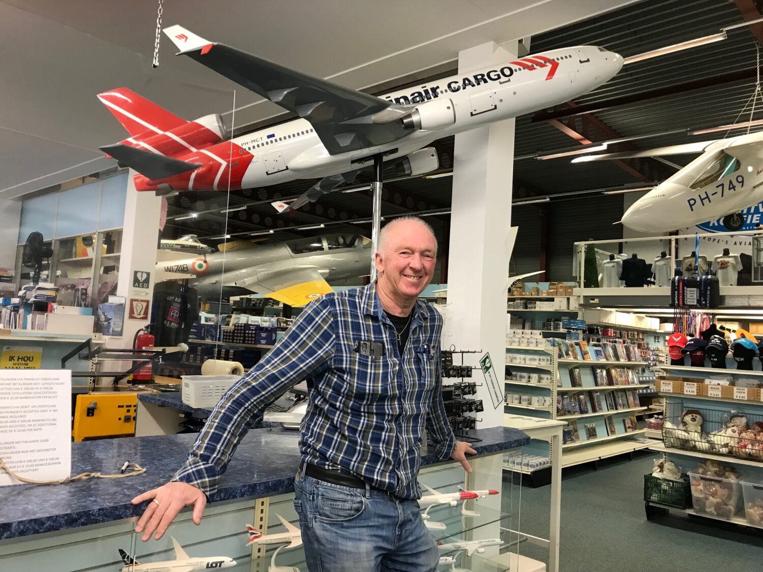 Niet alles in de ’s werelds grootste Aviation Megastore is te koop. Bij de kassa staat een groot MD-11-model in Martinair-beschildering. ‘Die betekent te veel voor mij’, zegt de voormalige Martinair-gezagvoerder. ‘Als iemand er interesse voor heeft dan bestel ik er wel één.’ De Dakota-cockpit kan er niet meer uit. Dat geldt ook voor de Iskra, WI748, en de American Eaglet, PH-749. ‘Van de luchtmacht had ik de toezegging voor bruikleen van een Starfighter. Het plan was die op het restant van de molen neer te zetten. De gemeente vond dat prima alleen dachten de buurtbewoners er anders over’, vervolgt hij.