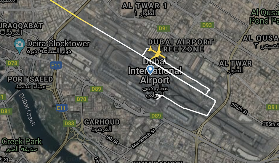 Het toestel, registratie A6-EQA en vluchtnummer EK524, ging van start op Dubai International Airport om op weg gaan naar Hyderabad (India). Het had een snelheid van 100 knopen (omgerekend circa 185 km/h) toen het de start op baan 30R moest afbreken omdat een ander vliegtuig kruiste. De 777 vertraagde en verliet de startbaan via taxibaan N4 achter de A6-EBY, het toestel dat de baan opreed toen de A6-EQA met de start begon. Tijdens het incident vielen er geen gewonden. Het vliegtuig liep evenmin schade op. Dertig minuten later vertrok het toestel alsnog naar de Indiase stad.