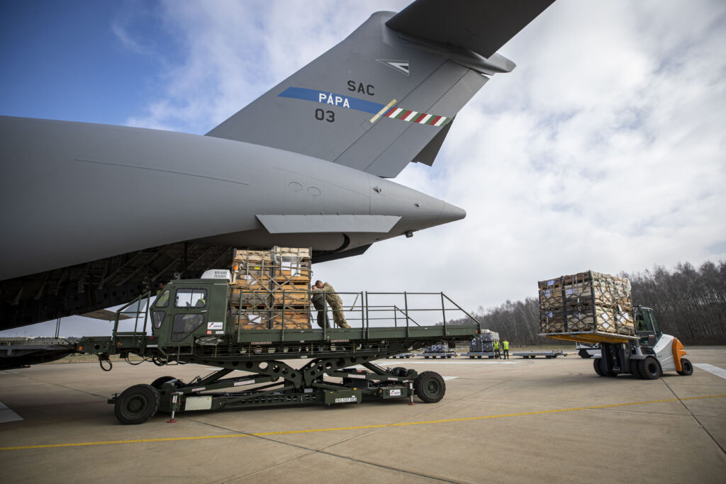 Vijftig Panzerfaust 3-antitankwapens met 400 raketten en 200 Stinger-luchtdoelraketten zijn op weg naar Oekraïne. Daarnaast vervoert het vliegtuig ook honderd scherpschuttersgeweren met 30.000 stukt munitie, en twee duikvaartuigen. De goederen worden met een C-17 van het samenwerkingsverband Strategic Airlift Capability (SAC) vervoerd naar een land in Oost-Europa. Van daaruit worden de wapens over de weg naar Oekraïne vervoerd. Omwille van de veiligheid doet Defensie verder geen uitspraken over hoe de militaire goederen in Oekraïne komen.