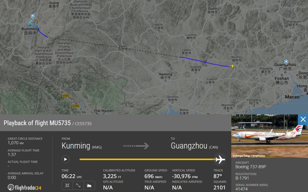 Maandagochtend (Nederlandse tijd) werd bekend dat een Boeing 737-800 van China Eastern Airlines verongelukt is in het zuiden van China. Het toestel had 123 passagiers en negen bemanningsleden aan boord, en was als vlucht MU5735 onderweg van Kunming naar Guangzhou. Het vliegtuig stortte neer in een bergachtige omgeving bij Wuzhou, gelegen op ongeveer driekwart van de route. Al gauw werd aangenomen dat er geen overlevenden zijn, waarmee dit het eerste dodelijke vliegtuigongeluk in China in ruim een decennium. De Chinese president Xi Jinping heeft een grootschalig onderzoek naar de crash ingesteld.