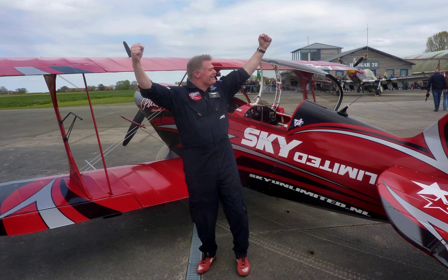 Het huidige record ‘Most times to take off and land’ is sinds 2020 in handen van de Amerikaan Steven Chase. Het lukte hem op 16 mei van dat jaar in Broomfield, Colorado (USA) om vijftien take offs and landings in één uur tijd af te werken. “Het was wel even hard werken, maar het ging prima”, is Evers’ eerste reactie wanneer hij uit zijn vliegtuigje stapt en het applaus van het talrijke publiek in ontvangst neemt. “Mijn benen voelen aan als pap en ik heb spierpijn tot achter mijn oren maar het was fantastisch om te doen”, aldus de piloot. Honderden toeschouwers zagen de rode ‘Pitts Special’ PH-PEP naar ruim 300 meter hoogte klimmen om vervolgens bijna stijl naar beneden te duiken en weer te landen. De Nederlandse stuntpiloot en vliegschoolhouder Dirk Evers van Sky Academy uit Lelystad maakt er een prachtig spektakel van.