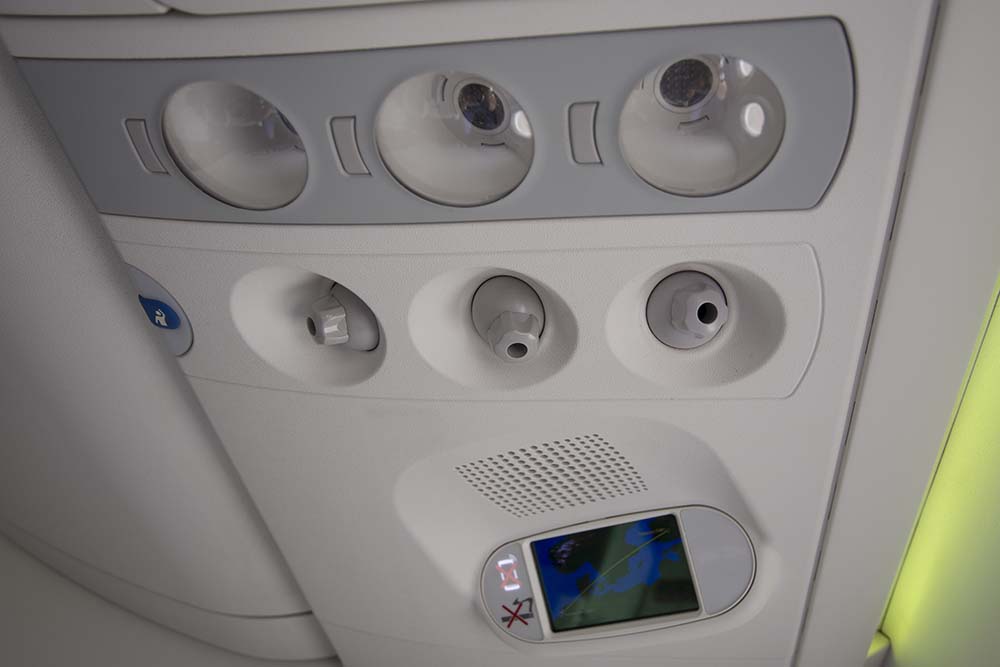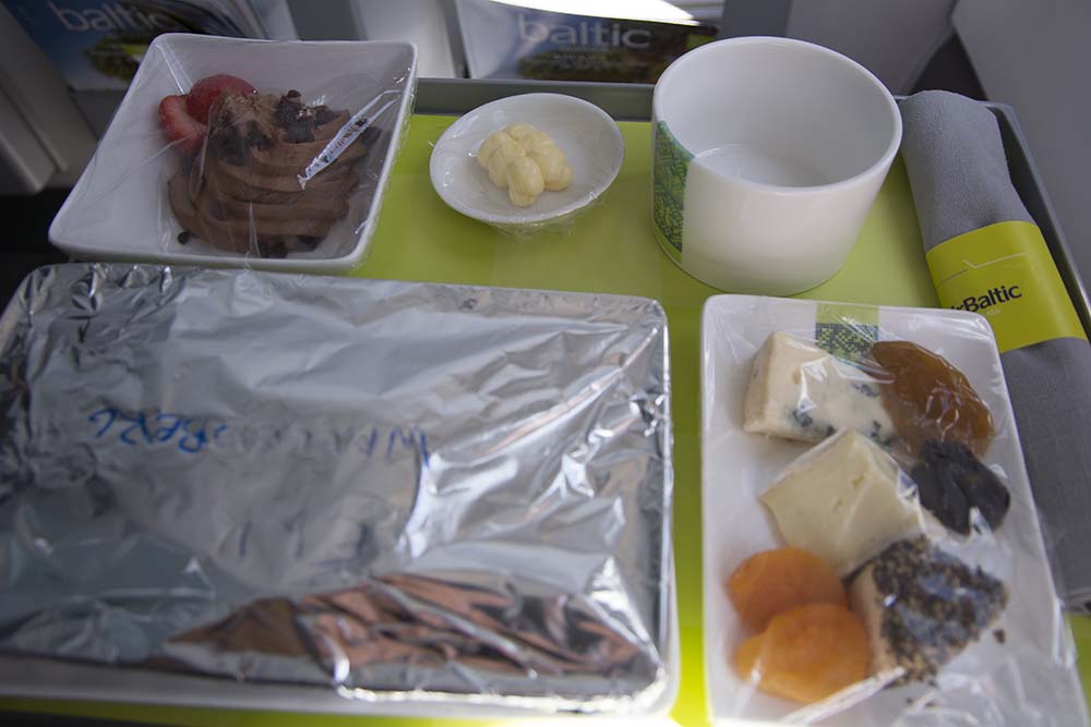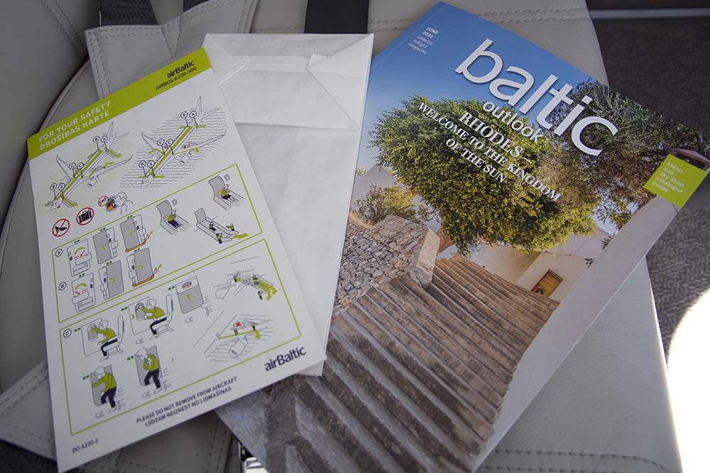 Via e-mail en sms had airBaltic aangegeven dat de vlucht 10 minuten later zou vertrekken. Dat werden echter 45 minuten. Oorzaak van de vertraging was een tankbeurt en traffic flow op Schiphol. Eenmaal aan boord valt op dat de Airbus een modern toestel is. Prima zittende stoelen, voldoende beenruimte en grote handbagagebakken. De premium service begon direct met het uitdelen van de menukaart, het aanbieden van het eerste drankje en de vraag wanneer de warme lunch geserveerd kon worden. Een krantje was niet aanwezig.