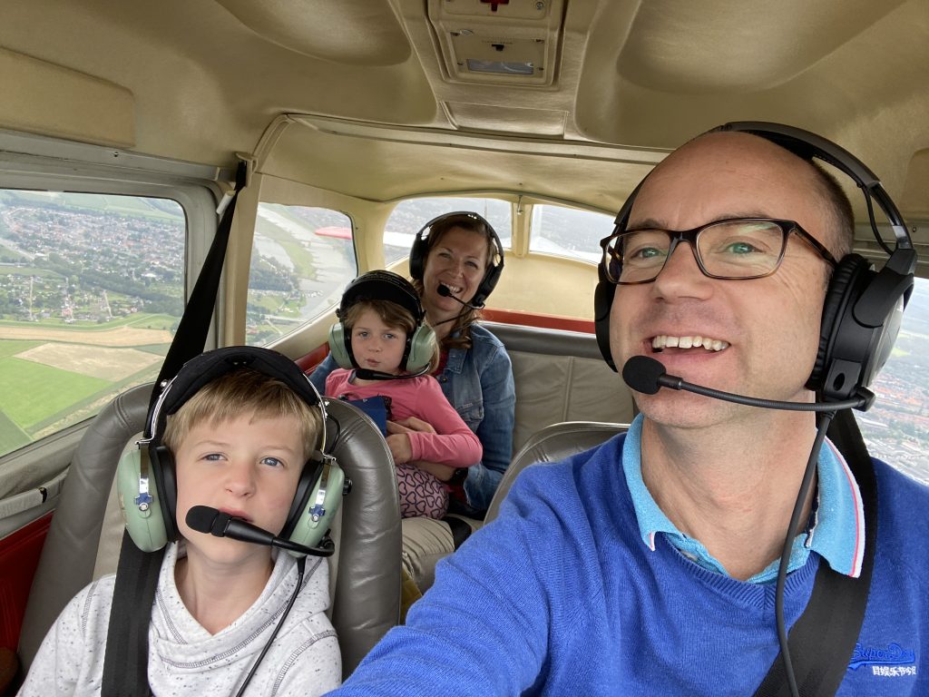 Na zijn opleiding aan de middelbare school kon Joost door naar de KLM Flight Academy. Met zijn vliegbrevet eenmaal op zak kon hij bij KLM Cityhopper plaatsnemen op de rechterstoel van de Fokker 70. Ruth ging, eenmaal in het bezit van wat wel eens het blauwe papiertje wordt genoemd (in werkelijkheid is het groen), door met de opleiding tot vlieginstructeur. Na een klein jaar in deze functie werkzaam te zijn geweest bij Flight Center Lelystad kon zij in dezelfde functie aan het werk bij de KLM Flight Academy. Toen zij ruim vijf jaar later ook op de rechterstoel van de Fokker 70 belandde, zat Joost inmiddels op de linkerstoel. En het was in de cockpit van dit vliegtuigtype waar het stel elkaar voor het eerst ontmoette. ‘Ik was net in dienst toen we een week met elkaar waren ingedeeld’, zegt Ruth. ‘Als ik Joost ’s ochtends bij het ontbijt zag, vond ik het steeds weer leuk hem te zien. Ik werd dan heel blij vanbinnen, terwijl ik helemaal niet bezig was met het vinden van een partner.’ Joost vult met een brede glimlach aan: ‘Ik vond haar meteen een wel heel erg leuke copiloot.’ Al snel volgde een afspraak in Leiden, de woonplaats die ze met elkaar bleken te delen, en het werd ‘dikke mik’. Een huwelijk volgde en inmiddels zijn ze twee kinderen rijk: de achtjarige Naud en de zesjarige Annemijn. Met hun vliegcarrière ging het uiteindelijk wel verschillende vliegtuigen in: Joost is gezagvoerder op de Boeing 737 en Ruth copiloot op de Boeing 777 en 787.