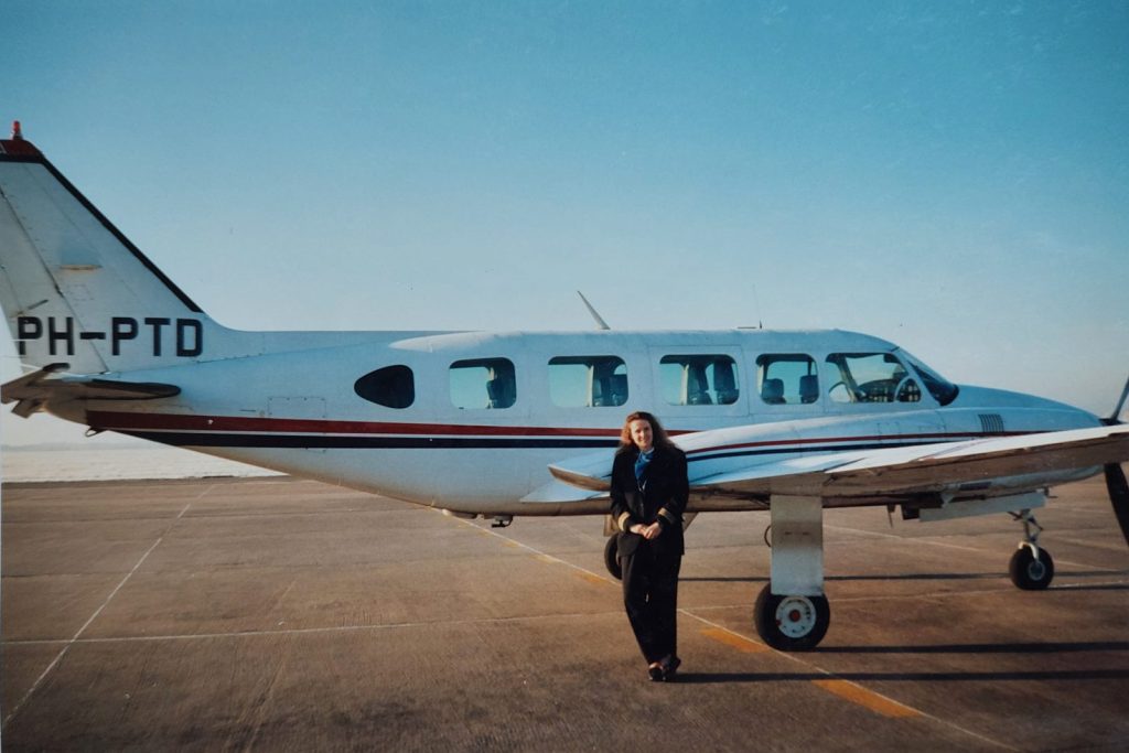 Een jaar later ging Yvette dus vliegen bij S&S Drückfarben. ‘De eerste tijd vloog ik op een Cessna 421 Golden Eagle, de PH-VMC. Toevallig genoeg was die kist eerder van Pon geweest. Het was deze machine waarmee mijn copiloot en ik een keer in een wolk terechtkwamen, zo’n dekbed. Ik wist meteen dat die wolk mijn vriendje niet was. Hij was nog geladen, hij moest zijn ei nog kwijt. We werden volop geraakt. De motoren bleven het doen, de instrumenten werkten nog goed en ik zag nergens rook. Zolang ik vlieg vlieg ik, dacht ik. Ik besloot door te vliegen naar Teuge. Nadat de passagiers en mijn collega waren uitgestapt liep ik een rondje om het vliegtuig. Overal gaten! In de romp, de gondel, de vleugels. Reparatie ging vier maanden duren. Dat werd een andere machine huren, een Cessna 402. Later huurden we die nog een keer. Ik ging hem halen in Lelystad. Een man in pilotenuniform wachtte me op. “Ken je dat vliegtuig?”, wilde hij weten. “Ja”, zei ik. “Heb je er wel eens op gevlogen?”, vroeg hij verder. Hij kreeg een paar wedervragen van mij: “Heb je het journaal daar liggen? Zou je daarin eens willen kijken?” Hij kon met geen mogelijkheid meer om mij heen, overal stond Yvette Lugtigheid.’