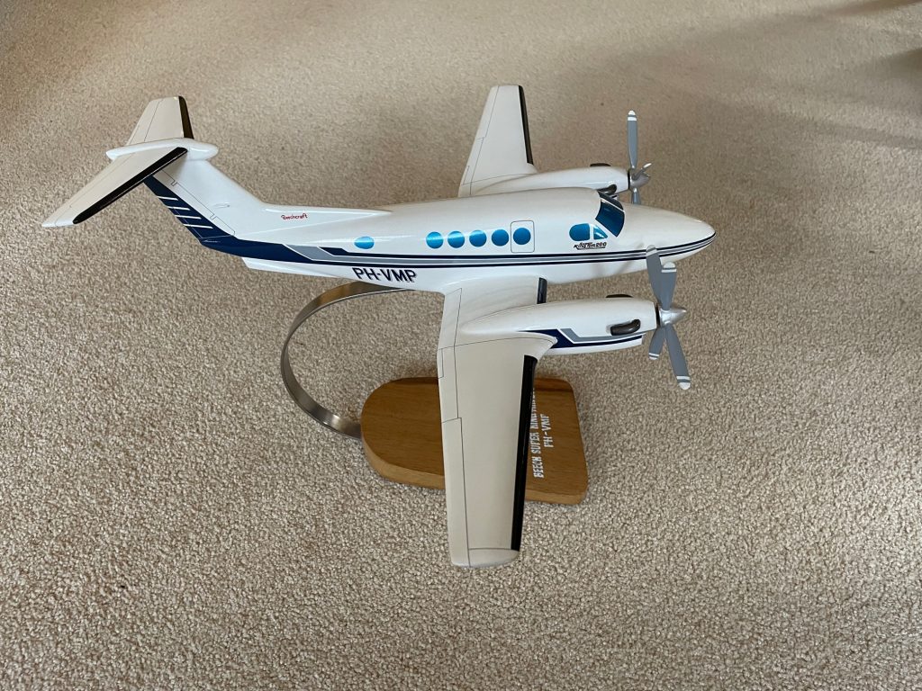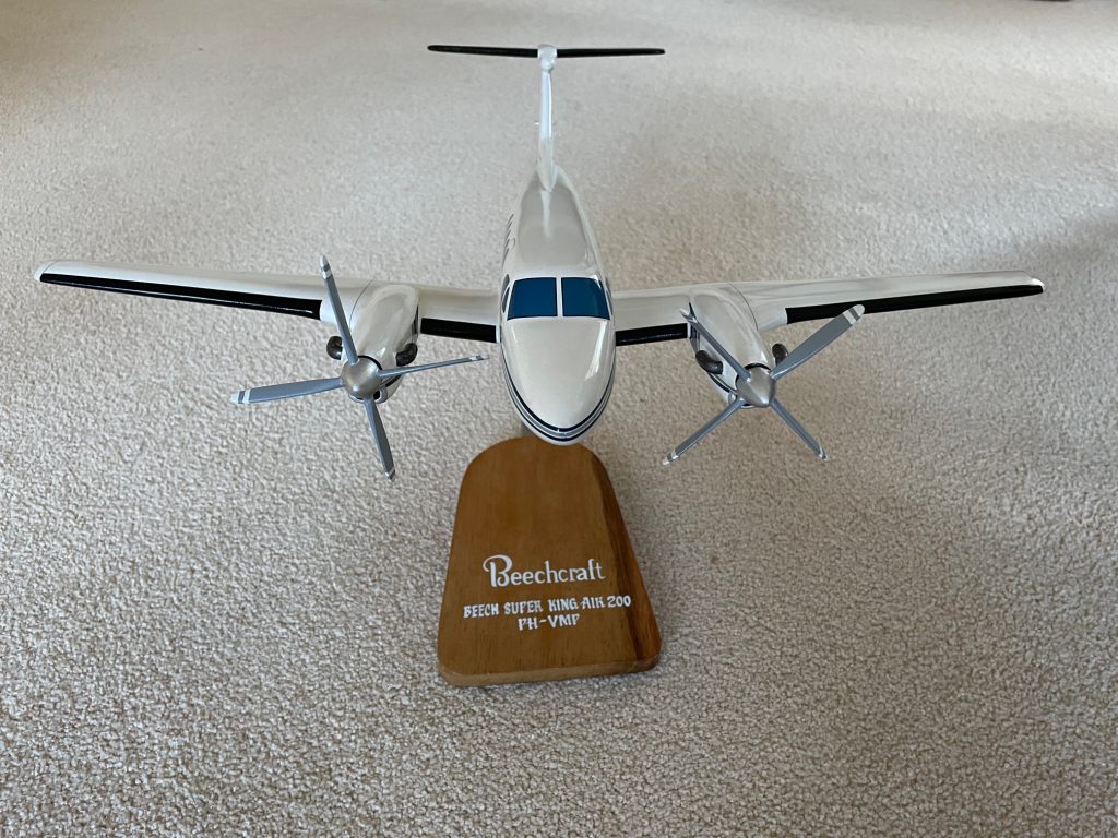 ‘Pon beschikte over één eigen vliegtuig’, zegt Yvette, ‘een Beechcraft B200 Super King Air.’ Ze zet een schaalmodel van het toestel op tafel. Het is voorzien van het kleurenschema en het registratienummer PH-VMP uit de tijd waarin Pon de machine in eigendom had. ‘Vlieg Met Pon’, betekende dat’, zegt Yvette met een lach. Er moest eens een vlucht worden gemaakt naar Gdansk. Yvette: ‘Vanaf een bepaalde hoogte was daar geen radar en alle informatie was in het Pools. Vandaar dat ik van tevoren de deal had gemaakt dat er iemand die Engels sprak aanwezig zou zijn op de toren. We hadden papieren bij ons in zowel het Engels als het Pools waaruit bleek dat we toestemming hadden om daar te landen. Ik wilde natuurlijk niet in het gevang terechtkomen! Eenmaal boven het veld wilde ik pas dalen als er contact was met die Engels sprekende verkeersleider, die ervoor zou zorgen dat het gebied onder ons vrij van vliegverkeer zou zijn. Na een kwartier rondjes te hebben gedraaid kwamen we uit de wolken. Eenmaal geland vond mijn collega dat ik maar naar achter moest om de deur open te maken. Verbaasd vroeg ik: “Hoezo?” Hij: “Kijk daar maar eens.” Weldra zag ik het ook: allemaal politieagenten en militairen met geweren en zure gezichten. Ik doe die deur dus open, nou, ze wisten niet wat ze zagen. Mij, een vrouw, met vier strepen. De strakke tronies van die mannen veranderden in lachende gezichten. Toen de passagiers desgevraagd hun paspoorten lieten zien, wilden die mannen de stempels er op de achterkant van de vleugel in zetten. Nou, mooi niet, ik wilde geen gat in de vleugel!