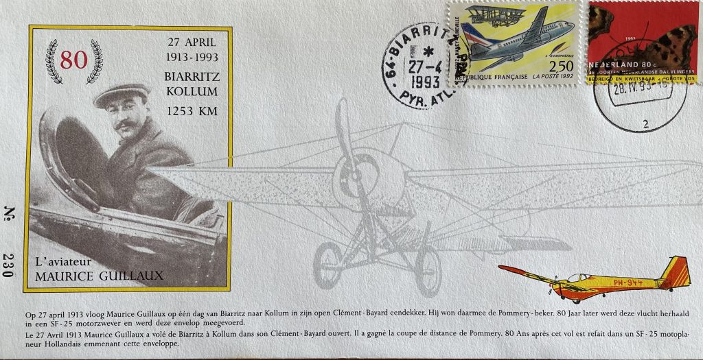Bijzonder is ook het boekje dat hij schreef met de titel Biarritz Kollum in 1 day. Henk: ‘In 1992 ontdekte ik dat Maurice Guillaux, een Franse vlieger, in een Clément-Bayard in één dag een vlucht had gemaakt van Biarritz naar Kollum. Het intrigeerde me mateloos. Op Hilversum werkte iemand met dezelfde achternaam als de Fransman, al werd die wel anders geschreven. Ik vroeg hem of we die vlucht samen zouden navliegen. Dat moest dan met een motorzwever omdat die niet harder gaat dan 140 kilometer per uur. Hij zag het niet zitten, in tegenstelling tot Cees Quist, de toenmalige havenmeester van Vliegveld Hilversum. Op 27 april 1993, tachtig jaar later dan Maurice, gingen Cees en ik er samen voor. Het werd een tocht met regen en harde wind. Had Guillaux de afstand in negen uur gevlogen, wij strandden na elf uur en 38 minuten uiteindelijk in Hilversum, 22 minuten voor zonsondergang. En we moesten nog 130 kilometer. Tot onze grote teleurstelling was het ons niet gelukt. Een dag later zetten we dan toch het wiel van onze PH-944, een Scheibe SF.25C Falke, neer op een door de Rijksluchtvaartdienst goedgekeurd pas gemaaid boerenveld en haalden we toch nog op het nippertje De Telegraaf.’