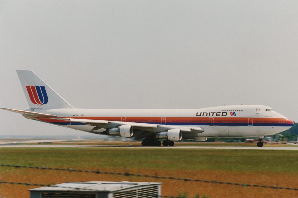 Kort nadat ik de eerste kist met een wow-factor, een MAS Air Cargo-A330-343(P2F) heb gefotografeerd zie ik tot mijn verbazing al een grote kist uitklimmen na de start vanaf de 25C. Goed, ik zat met mijn gedachten in 1993, maar toch niet gehoord dus! Ik grijp mijn verrekijker en zie dat het een United Airlines-Boeing 777-300 is die zich in een bocht naar links gooit om steden als Mainz en Wiesbaden te mijden, waarna hij richting de Nederlandse kust zal draaien. Ik begrijp dat de Bundesautobahn 5 de vertrekkende kist volledig heeft gemaskeerd in decibelletjes. Vroeger gewoon ondenkbaar!