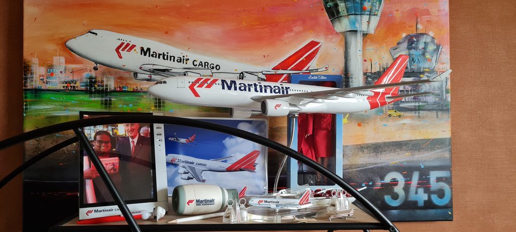 ‘Ik denk niet dat er ook maar een van de onlangs bestelde Airbus A350F’s in Martinair-kleuren zal vliegen. De PH-MPS zal de laatste zijn. De MPS: Mijn Partner Simon, zo zeg ik altijd maar. Gelukkig heb ik Klazienaveen Airport hier. Daar blijft Martinair te bezichtigen.’ Niet dat Simon daar iedereen wil verwelkomen. ‘Nee, ik wil daar niet iedereen hebben’, zegt hij stellig.