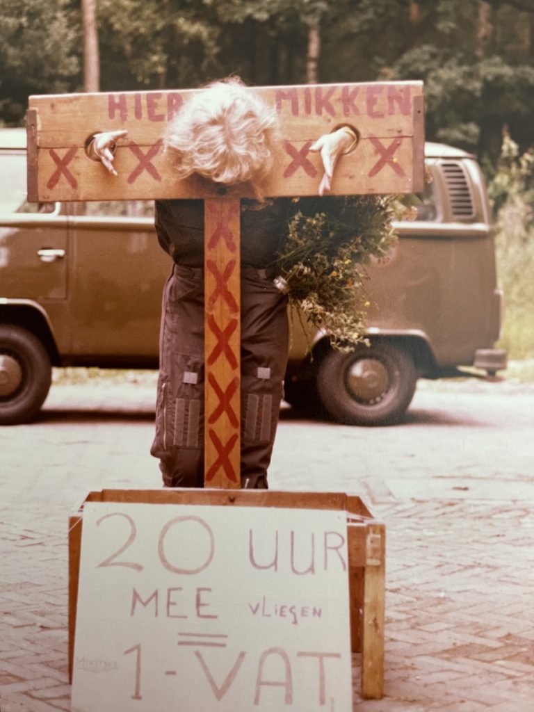 Ook bij Squadron 313 behelsden de werkzaamheden van Ditte meer dan enkel tijdschrijven. ‘Steeds vaker kreeg ik te horen dat ik het maar moest regelen’, zegt ze. ‘Waren er lege backseats dan moest ik ervoor zorgen dat die werden opgevuld met verzoekaanvragen. Maar die waren er dus niet altijd en dan stond ik meteen vooraan. In de loop van de tijd heb ik aardig wat backseat-vluchten mogen meemaken. Toen ik van mijn twintigste backseat-vlucht terugkwam, werd ik bij de kist opgehaald en naar het schandblok gebracht dat uit twee planken op een paal bestond. Mijn hals en beide polsen moest ik op de daarvoor speciaal aangebrachte uithollingen in de onderste plank leggen en hup, daar sloten de jongens de andere plank over me heen, wegkomen was er niet bij. Het volgende moment kwam de brandweer opdraven en werd ik drijfnat gespoten. Ditzelfde ritueel was traditie bij de vliegers als ze duizend uur hadden gevlogen. Maar ik werd erop getrakteerd na twintig vluchten.’ Ditte kan er nog altijd van harte om lachen.