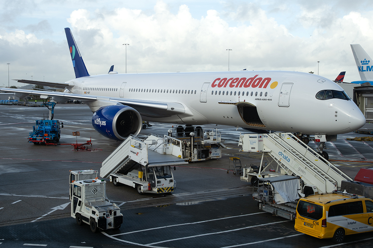 Smaken verschillen maar velen vinden de A350 een mooi vliegtuig. Onder de vleugels hangen twee reusachtige Rolls-Royce motoren. De zwarte randen rondom de cockpitramen doen een beetje denken aan een Space Shuttle. Voor de luchtvaartliefhebber is het jammer dat de Airbus niet in volledige Corendon-kleuren vliegt. Er staan alleen grote Corendon-titels op de romp. De gemiddelde passagier zal het waarschijnlijk worst wezen. De Airbus A350 maakte tien jaar geleden haar eerste vlucht. Er zijn er ruim 550 afgeleverd, de orderboeken puilen uit. Corendon is de eerste Nederlandse luchtvaartmaatschappij die met dit type vliegt.
