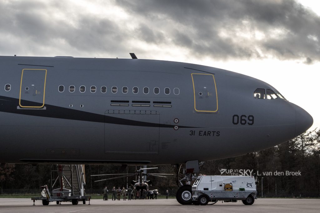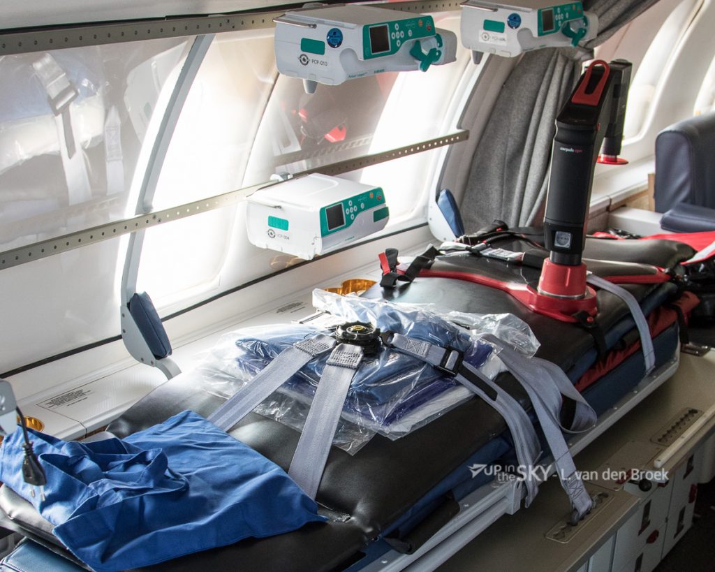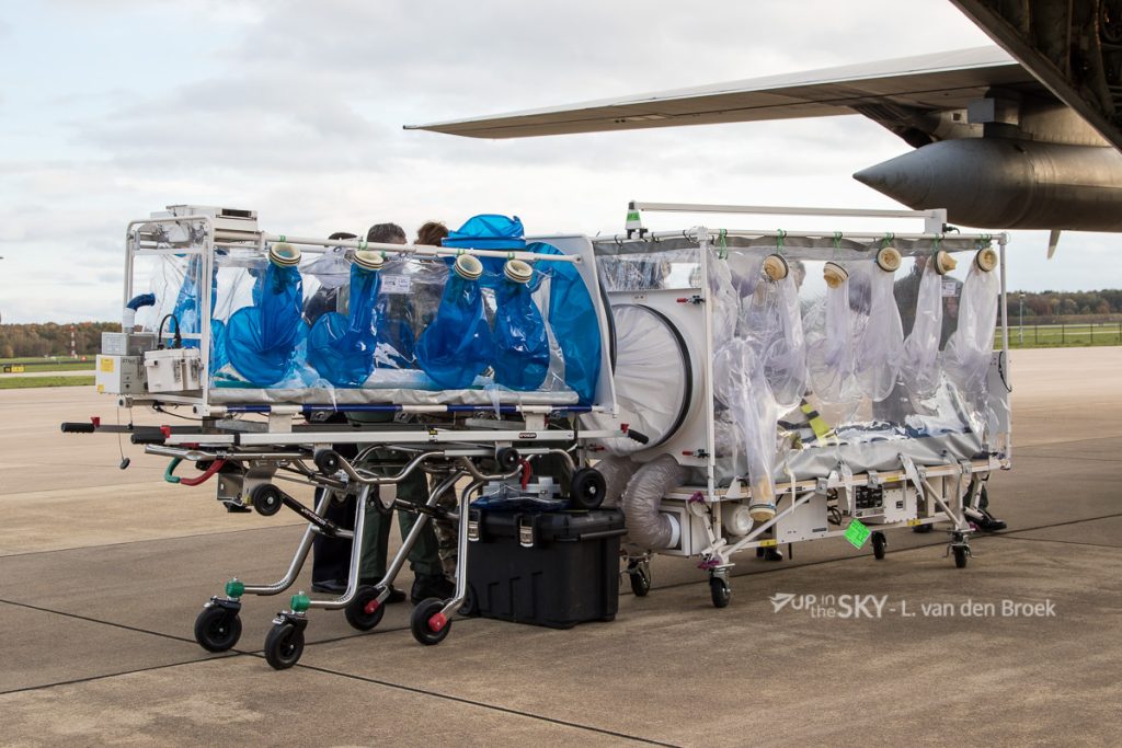 Een Italiaanse C-130J Hercules had een “Air Transit Isolator” meegenomen. Sinds 2005 gebruikt de Italiaanse luchtmacht een soort grote “flexibele couveuse”’ voor het vervoer van besmettelijke patiënten. Aanvankelijk werd de ATI vooral gebruikt voor patiënten met ziekten als Ebola en SARS, de afgelopen jaren werd deze isolatiecabine ook veelvuldig ingezet voor ernstig zieke Covid-patiënten. Een Italiaanse flight nurse licht toe: ‘In de Hercules kunnen we twee van deze brancards meenemen. In de KC-767 kunnen we zelfs tot maximaal vijf ATI’s vervoeren. Voor de verzorging gaat nog een team mee van meerdere artsen en verpleegkundigen, plus een technicus voor de apparatuur. De ATI werkt met het principe van onderdruk, zodat virusdeeltjes niet snel kunnen ontsnappen. Aan het plastic omhulsel van de ATI zitten handschoenen geïntegreerd. Hierdoor kunnen we de patiënt verzorgen of medicatie toedienen, hoewel het niet makkelijk werken is.’