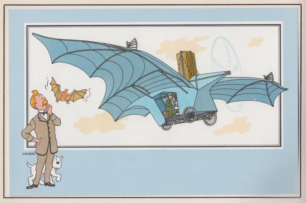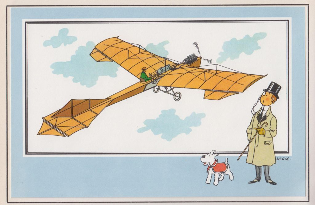 Wie denkt werk van Thijs Postma aan te treffen, zal vergeefs zoeken in de lijvige encyclopedie. ‘Nee, die heeft zich met deze tak van sport niet beziggehouden,’ zegt Bob. ‘Buck Danny-tekenaar Francis Bergèse en Hergé, die met name bekend is geworden door de avonturen van Kuifje, echter wel. Hergé gaf drie series uit van ballonnen en vliegtuigen. Kuifje zelf of een andere stripfiguur, kregen er ook een plekje op, de ene keer linksonder, de andere keer rechtsonder, maar wel altijd altijd vergezeld van het hondje Bobbie. Deze zeldzame series werden geleverd bij Belgische producten.’