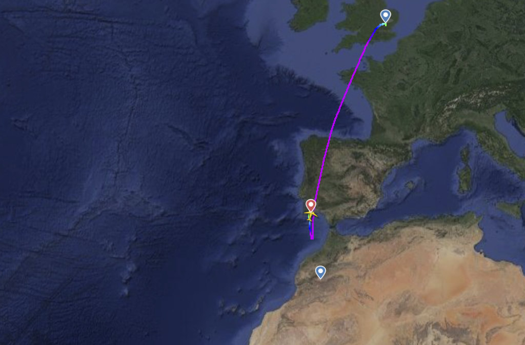 Het toestel, registratie G-RUKI, steeg dinsdag vroeg in de ochtend op vanuit Londen Stansted op weg naar Ouarzazate, een Marokkaanse stad ongeveer 200 kilometer verwijderd van Marrakesh. Via Het Kanaal, het westen van Frankrijk, de Golf van Biskaje, een deel Spanje en het oosten van Portugal zette de 737 de route richting Marokko voort. Toen het vliegtuig overstak vanuit het zuiden van Portugal naar Marokko, voelde een van de Ryanair-piloten zich niet goed. ‘Deze vlucht van Stansted naar Marokko werd omgeleid naar Faro toen een van de piloten ziek werd’, licht een woordvoerder van Ryanair toe bij Daily Mail. Daarop werd besloten om te keren richting het Europese continent. Op de luchthaven van Faro werd het ‘rode alarm’ afgegeven.