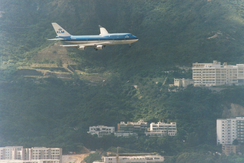 In de vele jaren waarin Peter 747 vloog, zette hij de wielen van de KLM-Jumbo uiteraard ook meermaals neer op de landingsbaan van het roemruchte Kai Tak Airport, Hongkong, dat op 6 juli 1998 werd gesloten. ‘Ik vond het altijd een leuke uitdaging om te doen’, zegt hij. ‘Ook heb ik als vlieginstructeur meerdere collega-vliegers mogen uitchecken op die fameuze IGS-approach RWY 13. Omdat je tussen de flats door moest vliegen, je kon bijna letterlijk zien wat mensen op hun tafel hadden staan, zei ik altijd tegen hen: “Denk al die flatgebouwen weg, beschouw het als een visual circuit halverwege een normale base turn to finals.” Volgens een omschreven naderingspatroon belandde je op de Localiser, inbound course 088, en volgde je de Glide Slope tot de Middle Marker met het beroemde wit met rood geblokte checkerboard, op de heuvel recht voor je. Rechts moest je dan al baan 13 in zicht hebben en op zo’n 600 voet draaide je in een dalende bocht 47 graden naar rechts voor de visual line up. Geen auto pilot dus maar alles op de hand. Sommige collega’s zagen er toch wel tegenop, maar ik vertrouwde hen.’