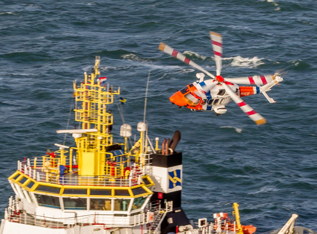 ‘Als we dienst hebben gaan we altijd wel de lucht in’, vervolgt Joeri. ‘Op één van de schermen in de OPS-room zien wij ook al het scheepvaartverkeer. Daarop kunnen we elk schip bekijken, net zoals je dat op FlightRadar24 met een vliegtuig kunt doen. Voor onze trainingen zoeken we vaak contact met schepen die passen binnen de geplande training. Een kapitein die we voor een training benaderen stemt daar altijd wel mee in want we zijn er ook voor hen. Is het geregeld dan koppelen we onze autopilot aan de koers en snelheid van dat schip en vliegt onze heli er gewoon naartoe in de meest optimale koers. Vaak vliegen we uit met procedures voor verminderd zicht met een echte instrumentdaling waarbij we ook gebruik maken van de radar, FLIR en alle functionaliteiten van de automatische piloot. Zijn we bij het schip dan gaan we hijsen, dus mensen op het dek afzetten en weer oppikken. Vervolgens zoeken we andere posities en zo zijn we wel een half uurtje bezig terwijl het schip intussen gewoon rustig doorvaart. Dat is wel zo handig want je wilt toch altijd een beetje luchtsnelheid hebben. Hoe meer snelheid je hebt hoe minder vermogen het kost om in een hover te blijven hangen en hoe veiliger het wordt. Ook op de schepen van de Kustwacht, waaronder de noodhulpsleper Guardian, wordt veel getraind.’