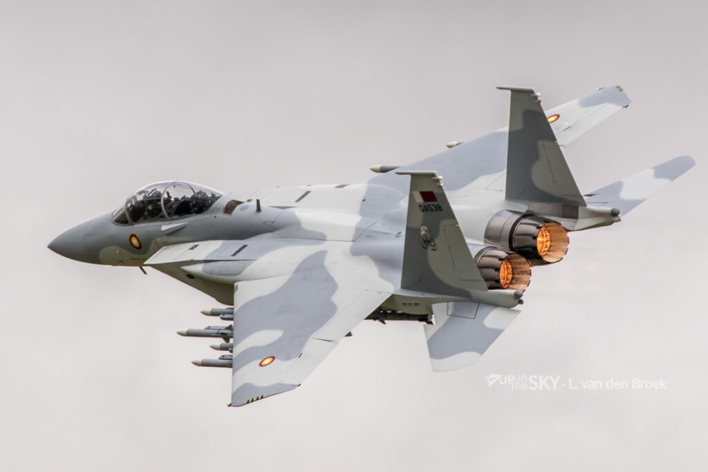 Naast vier verschillende toestellen op de grond (NH-90, C-17, Hawk Mk.167 en Typhoon) was er ook een gloednieuwe F-15QA in de lucht te bewonderen. Dit type is de Qatarese versie van de Boeing F-15E en wordt door de Qatari’s “Ababil” genoemd. Twee F-15QA’s waren op Fairford, nog eens twee andere zijn op de Farnborough airshow aanwezig. De toestellen moeten nog worden afgeleverd aan Qatar en werden tijdens de RIAT indrukwekkend voorgevlogen door testvliegers van Boeing.