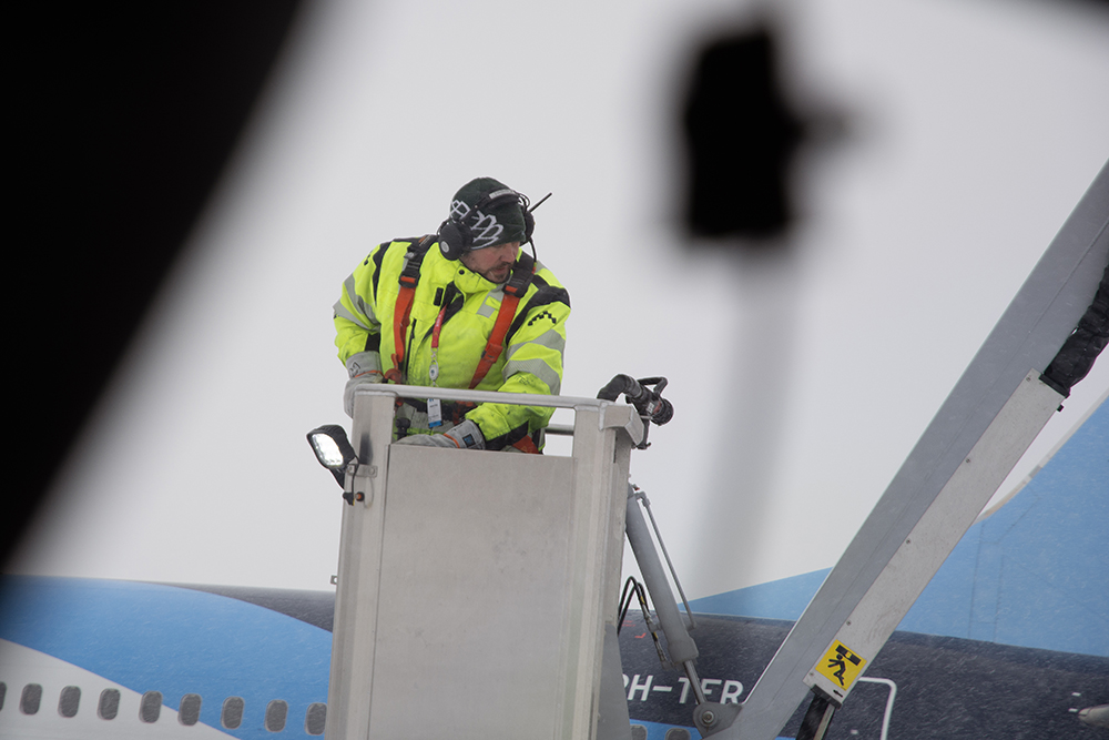 Het uitklappen van de jump seat is een taak van de cabin crew. Na even gestoeid te hebben met de veiligheidsgordel en na uitleg over het zuurstofmasker zit je first class met een goed zicht op beide vliegers, de instrumenten en de buitenwereld. Via de headset is alle communicatie te volgen. Het de-icing-proces begon om 12.05 uur. Het weer was nog steeds bar en boos. De captain en jonge vrouwelijke first officer werkten professioneel de checklists af en maakten calculaties waarbij rekening werd gehouden met de extreme omstandigheden: nauwelijks zicht door sneeuwval, gladde baan, crosswind, turbulentie, positieve en negatieve windshear. Er gaan geluiden op om vliegtuigen in de toekomst door één vlieger te laten besturen, met hulp vanaf de grond. Wie in moeilijke weersomstandigheden de workload ziet van beide vliegers en de noodzaak van twee paar ogen, vraagt zich af of dit wel zo’n goed idee is.