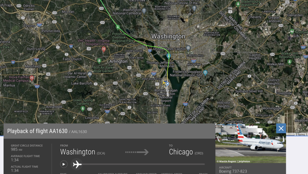 Het vliegtuig, registratie N856NN, steeg vorige week woensdag iets na 22:00 uur lokale tijd op vanaf Ronald Reagan Washington National Airport om vlucht AA1630 naar Chicago O’Hare International Airport uit te voeren. Het vertrok vanaf baan 1. Op een hoogte van 1.300 voet draaide de 737 licht naar rechts, terwijl dat niet is toegestaan. Dit gebied omvat een Special Flight Rules Area, een gebied waarin de normale procedures niet gelden.