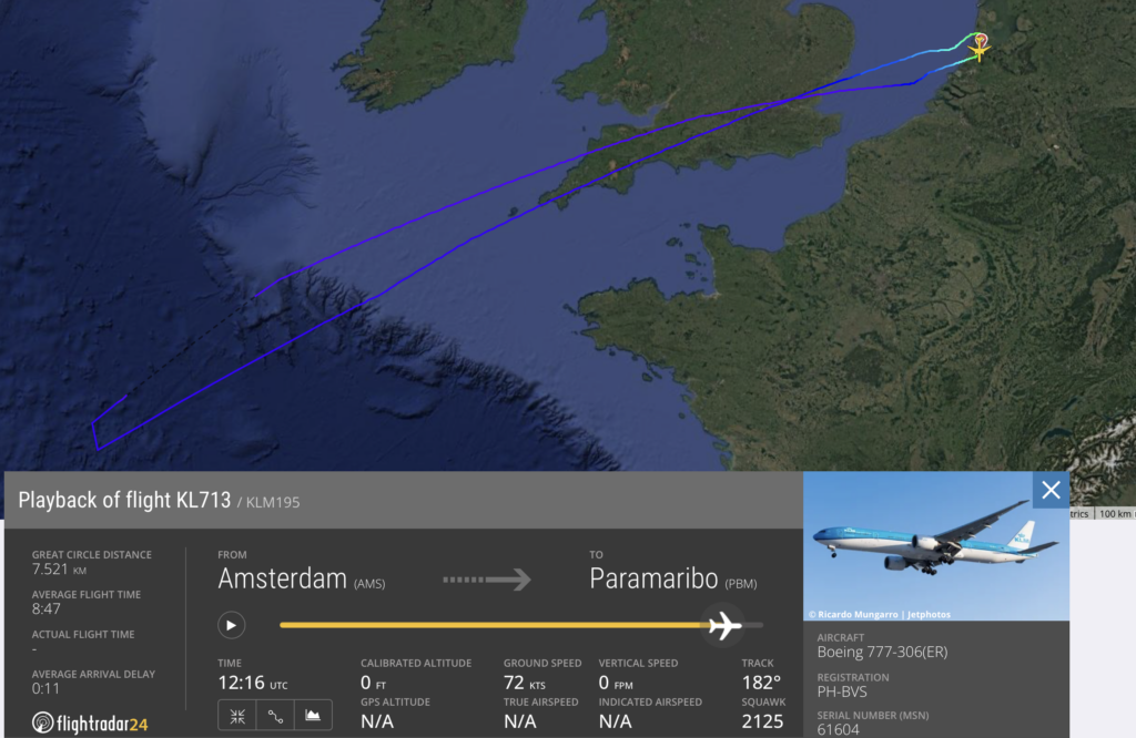 Op dat moment bevond de KLM-vlucht zich al enige tijd boven de Atlantische Oceaan, op een kwart van de afstand richting Suriname. Het is vooralsnog onduidelijk wat er precies aan de hand was, al lijkt het te gaan om een technisch mankement. Er zou naar verluidt iets aan de hand zijn geweest met een lek in het hydraulisch systeem. Iets meer dan vier uur nadat de machine ervandaan vertrokken was, stond de 777 weer veilig aan de grond op Schiphol.