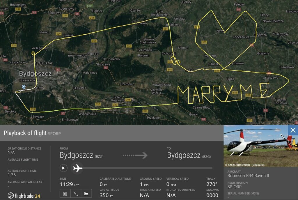 Alexander en Jacek waren namelijk al sinds begin september bezig met de voorbereiding van de vlucht, waarop Alexander Oliwia ten huwelijk zou vragen. Jacek koos bij het maken van een vliegplan een gebied uit waarin de helikopter ongestoord zijn gang zou kunnen gaan. Terwijl de twee passagiers genoten van het uitzicht, was de piloot druk bezig met het volgen van de nauwkeurig uitgestippelde route. In een kleine anderhalf uur tijd ’tekende’ hij op verzoek van Alexander de letters ‘MARRY ME’ en een hartje in de lucht.