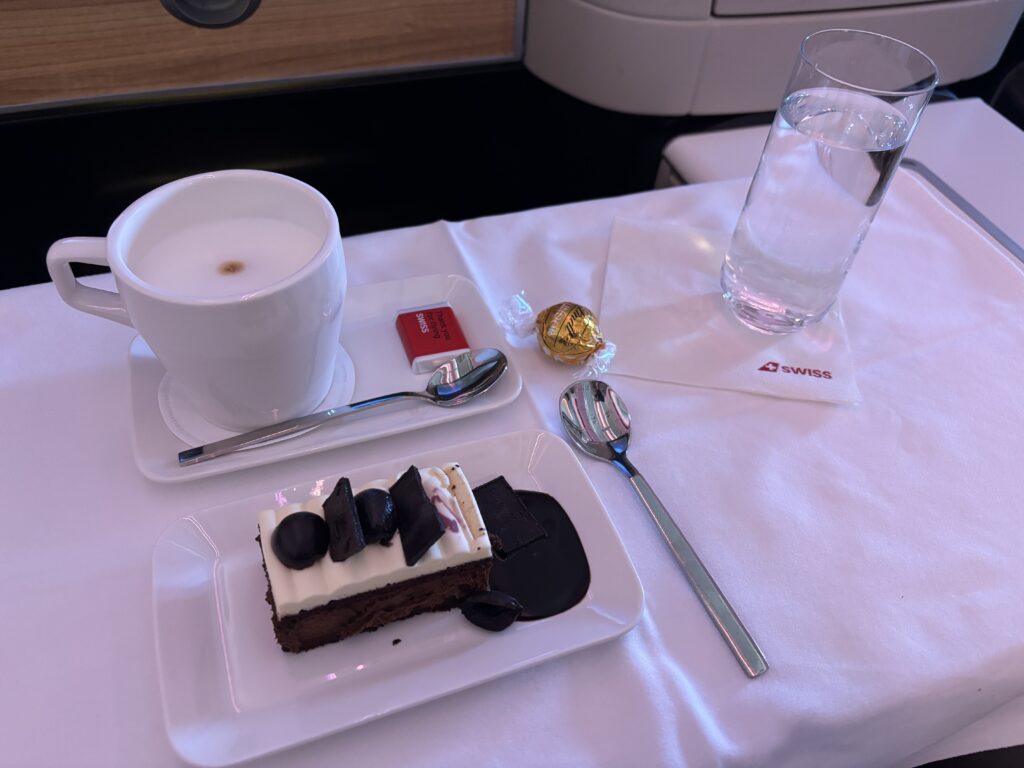 Kort na de start wordt een aperitief geserveerd. Swiss heeft in haar business class een erg nette wijnkaart met ruime keuze. De champagne is van supermarktkwaliteit, maar de wijnen zijn significant beter. Het drankje komt met een schaal nootjes terwijl de bestelling voor het ochtend-diner wordt opgenomen. Als voorgerecht kozen wij de garnalen, die lekker waren, maar op geen enkele manier bijzonder. Het broodje was niet koud maar ook absoluut niet warm en de boter was onspeelbaar. De biefstuk die als hoofdgerecht werd geserveerd was erg lekker en perfect medium, het was alleen jammer dat het geen mals vlees was. De Schwartzwäldertorte was erg goed en werd geserveerd met koffie, thee of een ander drankje naar keuze. Tijdens de maaltijdservice is het personeel vier keer langsgekomen om drankjes uit te delen en bij te schenken.