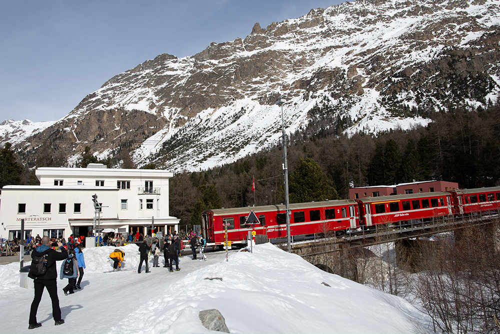 In het Oberengadin is tegen een redelijke prijs een ov-kaart te koop. Je hebt dan gedurende een aantal dagen gratis vervoer met trein en (post)bus. Erg handig voor wandelaars, die van het ene (bus)station naar het andere willen lopen. Een prachtige wandeling loopt van station Morteratsch naar de gelijknamige gletsjer. Ga vanaf Pontresina een stuk met de Bernina-spoorlijn richting Tirano in Italië. Dit is ongetwijfeld een van de mooiste spoortrajecten van Europa. Vanaf het stationnetje loop je in een uur door het bos naar de gletsjer. ’s Morgens is het licht voor de fotografen het beste, maar niet te vroeg, want dan ligt de gletsjer nog in de schaduw. Bij het restaurant naast het station kun je ’s middags heerlijk in de zon zitten, als er tenminste plek is.