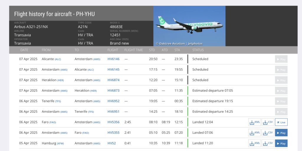 Het vliegtuig, met registratie PH-YHU, werd zaterdagochtend overgevlogen vanuit Hamburg. De gloednieuwe Airbus werd vervolgens vrijwel meteen ingezet voor een eerste aantal passagiersvluchten. Zo vloog Transavia de A321neo in de vroege zondagochtend op en neer naar Faro, en wordt later op de dag nog een retourtje Tenerife gemaakt. Maandag vliegt de YHU volgens de planning op en naar naar Heraklion en Alicante.
