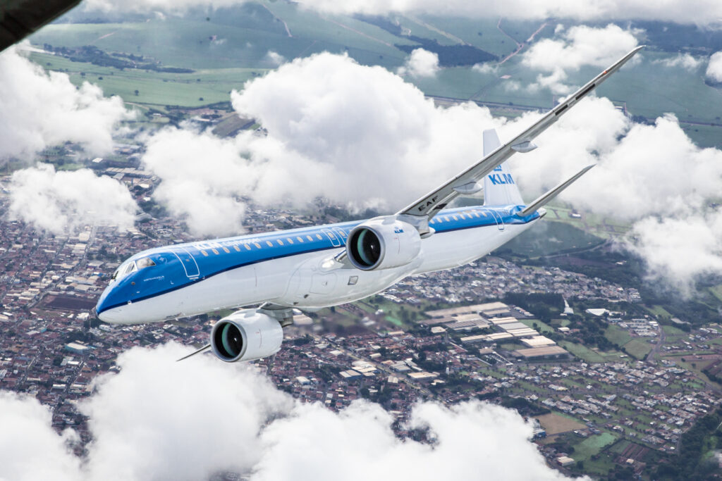 In vliegen op waterstof met een machine met om en nabij de vijftig tot honderd stoelen ziet Arjan op langere termijn nog wel een mogelijkheid. ‘Maar dat brengt technisch een enorme complexiteit met zich mee’, haast hij zich te zeggen. ‘Het omzetten van waterstof met behulp van een fuel cell naar elektrisch geeft immers heel veel hitte. Ook de beschikbaarheid van waterstof en de kosten ervan vormen vooralsnog een enorme barrière. Voor het grotere segment van Embraer, en dat is tot 150 stoelen, zeggen wij dat de eerste stap gewoon bestaat uit het efficiënter maken van vliegtuigen. Wat bijvoorbeeld KLM doet met de aanschaf van de veel brandstofzuinigere E195-E2’s, laat zien dat een vliegtuig met 35 stoelen meer dan de E190 die zij voorheen vlogen, dat je die stoelen erbij krijgt zonder meer brandstof te verbranden. Dat is dus CO2-neutrale groei. Die stap vormt voor ons de eerste prioriteit.’