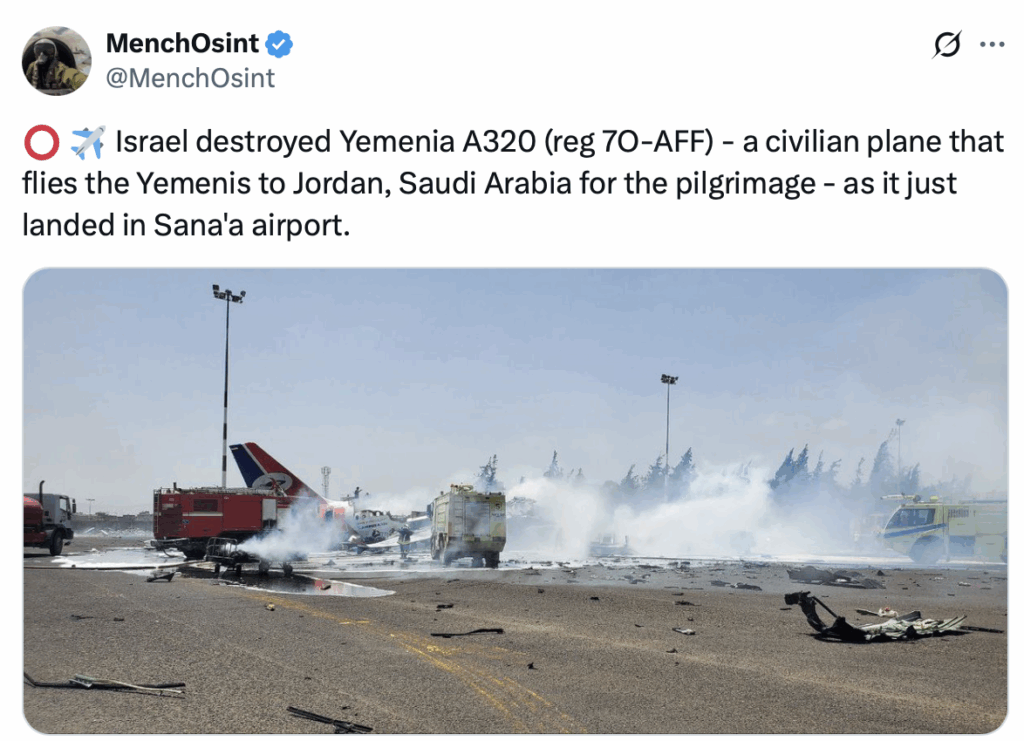 Met de vernietiging van de betrokken Airbus A320 is Yemenia Airways nu haar hele vloot kwijt. Bij een eerdere Israëlische luchtaanval, 6 mei jl. op Sanaa International Airport, gingen haar andere twee A320’s en enige A330 al in vlammen op. Een Ilyushin Il-76 van de Jemenitische luchtmacht trof daarbij hetzelfde lot. ‘De luchthaven van Sanaa zal keer op keer worden verwoest, evenals andere strategische infrastructuur die wordt gebruikt door de Houthi-terroristische organisatie en haar aanhangers’, zei Katz ter verdediging. Het betreffende vliegveld is de belangrijkste basis van de luchtmacht van Jemen. Eenheden met gevechtsvliegtuigen, helikopters en transportvliegtuigen zijn er gevestigd.