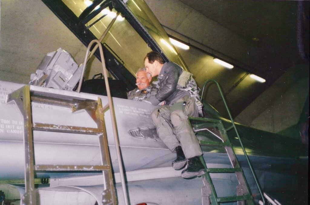 Zijn vader vloog ook nog in de tijd waarin Frank werd opgeleid. ‘Hij zat nog net op de NF-5 en toen heb ik met hem meegevlogen in de back seat.’ In Franks stem klinken trots en dankbaarheid door als hij zegt: ‘Hij vloog bij mij mee in de back seat toen ik klaar was met mijn opleiding. Ook vlogen we een keer samen in formatie. Net voor zijn pensioen ging hij bij mij mee in de F-16. En mijn vader zat links, ik rechts, toen hij, inmiddels vliegend op de F-27, op Soesterberg zijn allerlaatste landing maakte. Mijn broer, de techneut, was er ook bij. Hij zat op de jumpseat als forward facing boordwerktuigkundige.’
