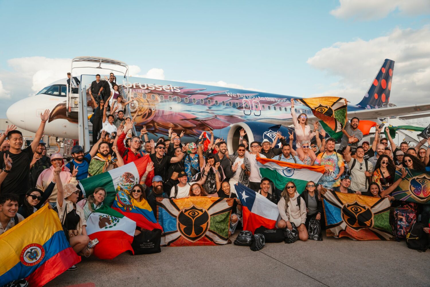 De eerste van de zeven exclusieve ‘party flights’ landde woensdag al vanuit Ibiza. Aan boord was de Belgische DJ Nina Black die de passagiers van muziek voorzag, geheel in de stijl van Tomorrowland. Andere ‘party flights’ vertrekken vanaf steden als Kopenhagen, Wenen en Barcelona. In totaal vervoert Brussels Airlines bijna 25.000 festivalgangers naar België.