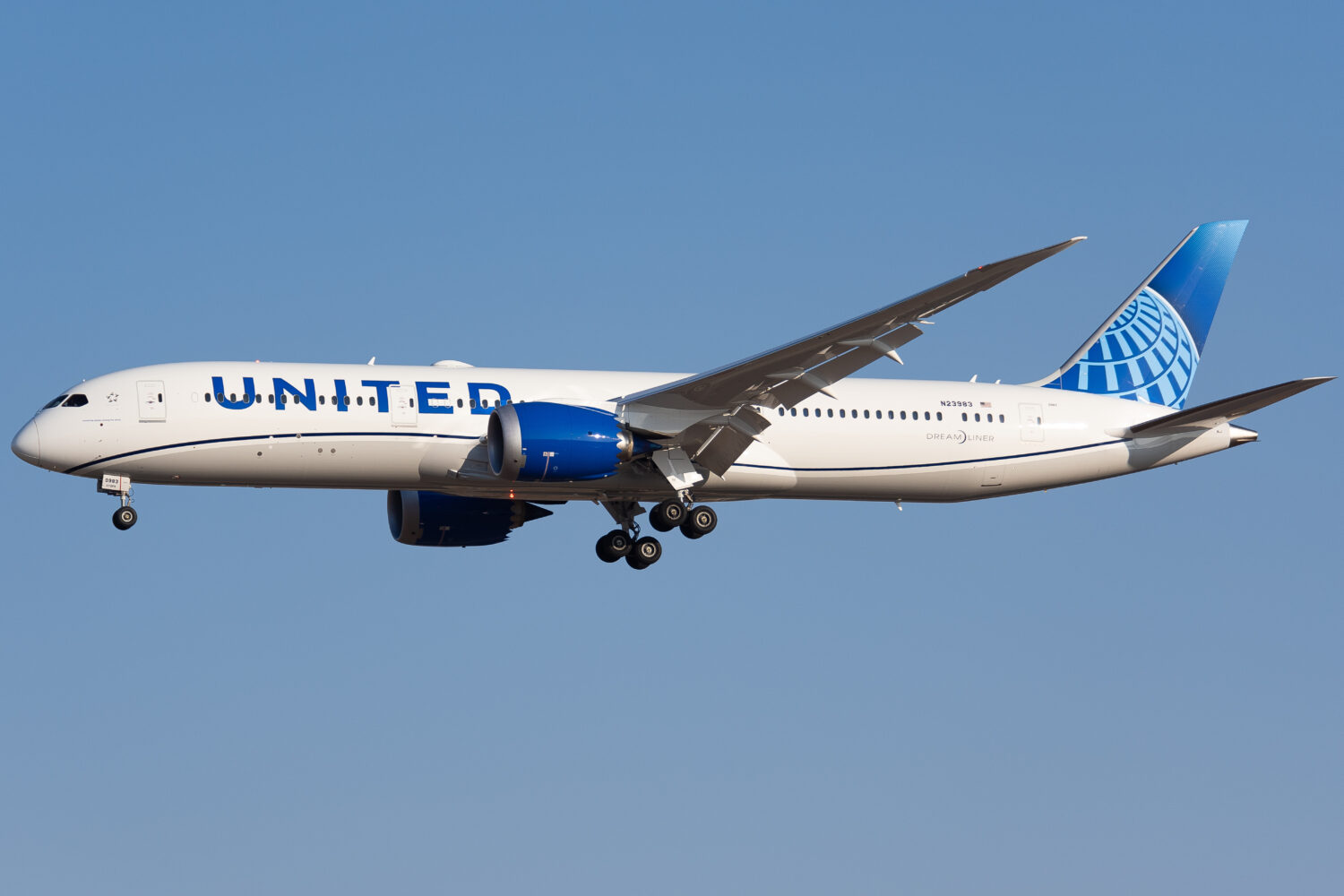 Het eerste toestel was de Dreamliner. De machine, registratie N23983, steeg 21:20 uur lokale tijd, één uur en tien minuten later dan gepland, met vluchtnummer UA1122 op in de richting van het Zuid-Afrikaanse Kaapstad. De 787 steeg in zuidelijke richting op en boog direct af voor de Atlantische oversteek. Een passagier vertelt aan AV Herald dat een halfuur na take-off trillingen in het vliegtuig te voelen waren. De gezagvoerder zou hebben gezegd dat mogelijk een deel van de vleugel afgebroken was.