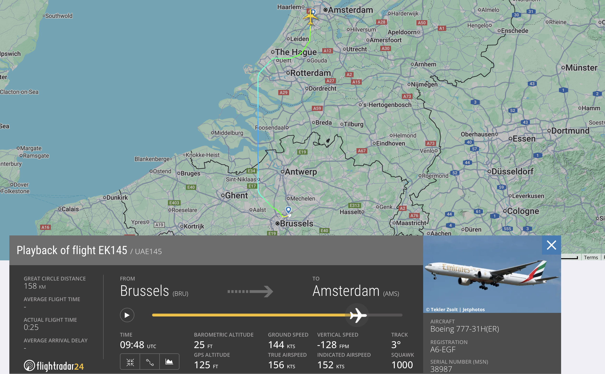 Een Boeing 777 van Emirates kon zaterdagochtend niet landen op Schiphol. Het toestel week daarop uit naar Brussel.