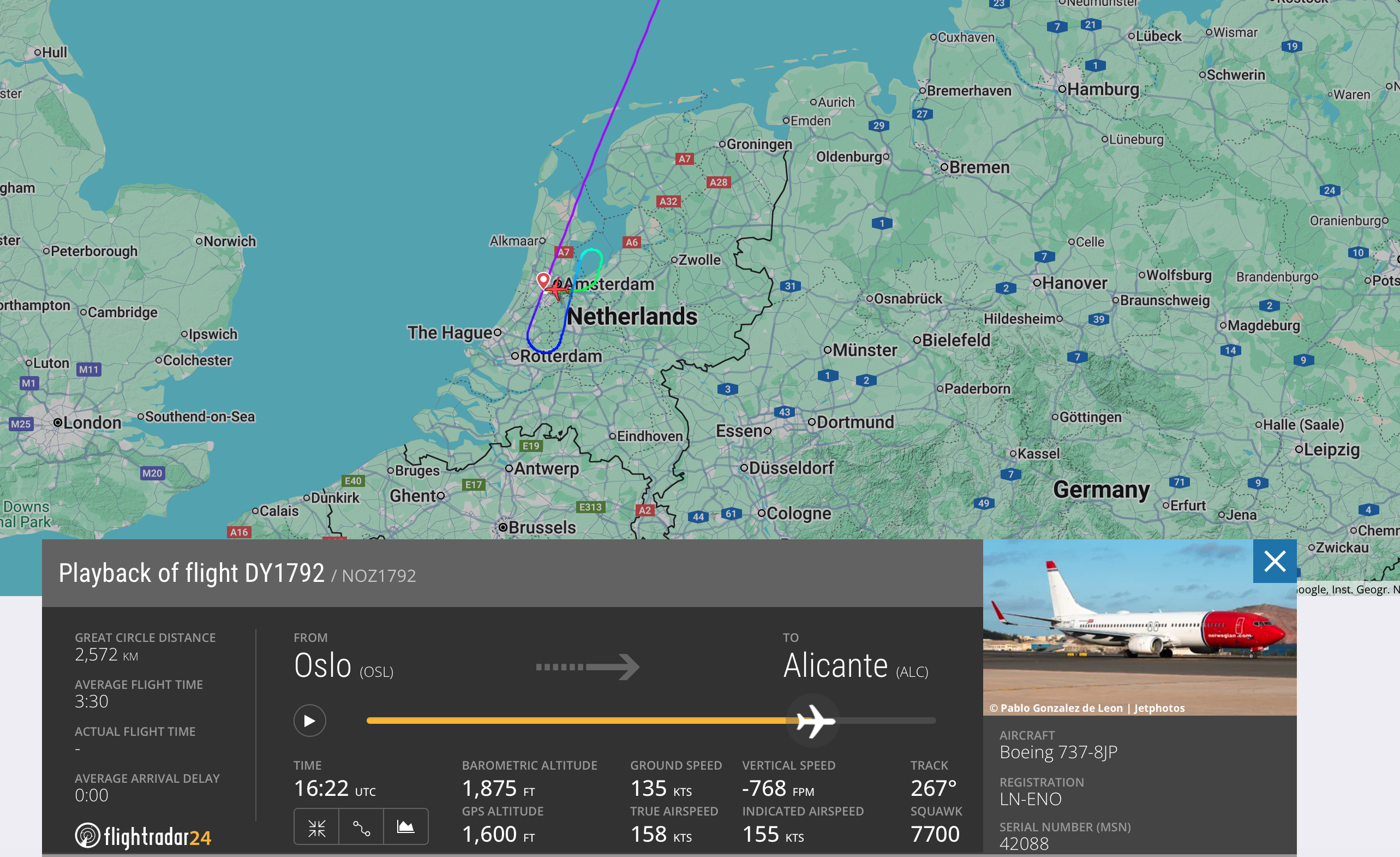Vlucht DY1792 was rond 15.30 uur vertrokken van de Noorse luchthaven. Toen de 737-800, registratie LN-ENO, zich op een hoogte van 38.000 voet boven de Noordzee bevond werd een ongewone geur opgemerkt. Daarop besloot de crew zo snel mogelijk te dalen en te landen op Schiphol. Slechts 23 minuten later landde de Boeing van de Noorse budgetvlieger veilig op de Buitenveldertbaan, gevolgd door de hulpdiensten.