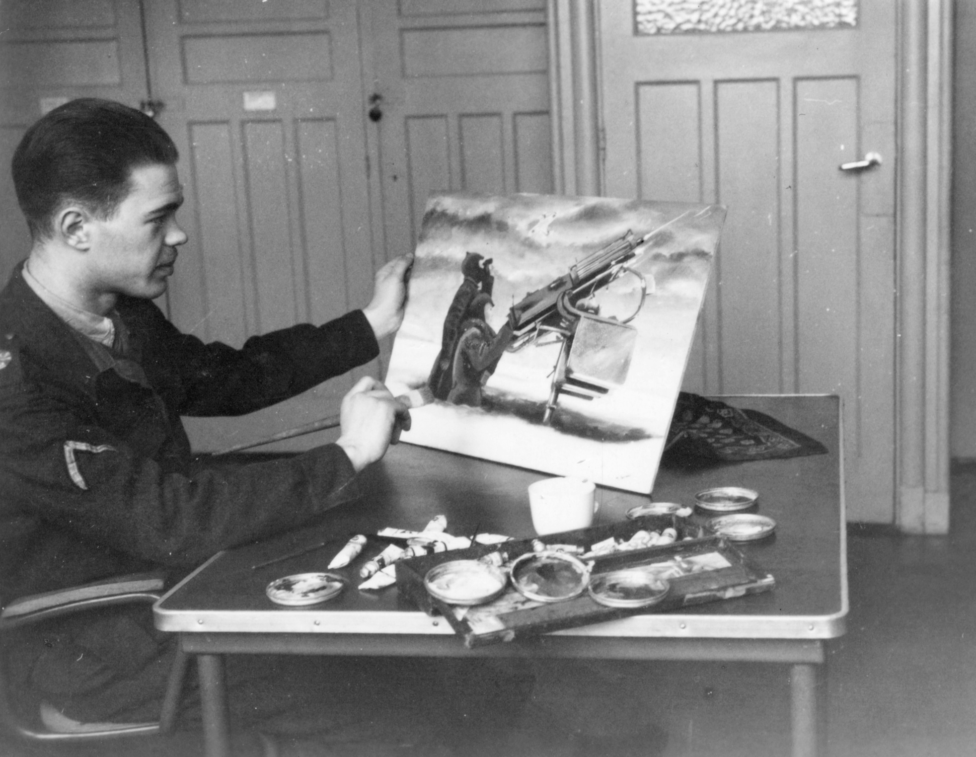 Eenmaal voorzien van zijn strepen kon Thijs algauw aan de gang als leraar vliegtuigherkenning. ‘Ik versierde de wanden van het lokaal met vliegtuigfoto’s en scharrelde overal modellen vandaan’, zegt hij. ‘De lessen maakte ik minder saai met verhalen over en bijnamen van de verschillende vliegtuigtypes. Ook vertelde ik dat er nogal eens machines door de eigen luchtartillerie werden neergeschoten omdat ze niet werden herkend. Intussen drong het ook door in de gelederen dat ik wel leuk kon schilderen. Dat resulteerde zelfs in de opdracht om voor een nogal autoritaire luitenant drie schilderijen te maken van luchtdoelkanonnen. Op houten panelen heb ik voor hem Duitse, Engelse en Russische kanonnen in actie getekend, compleet met hun bemanningen.’