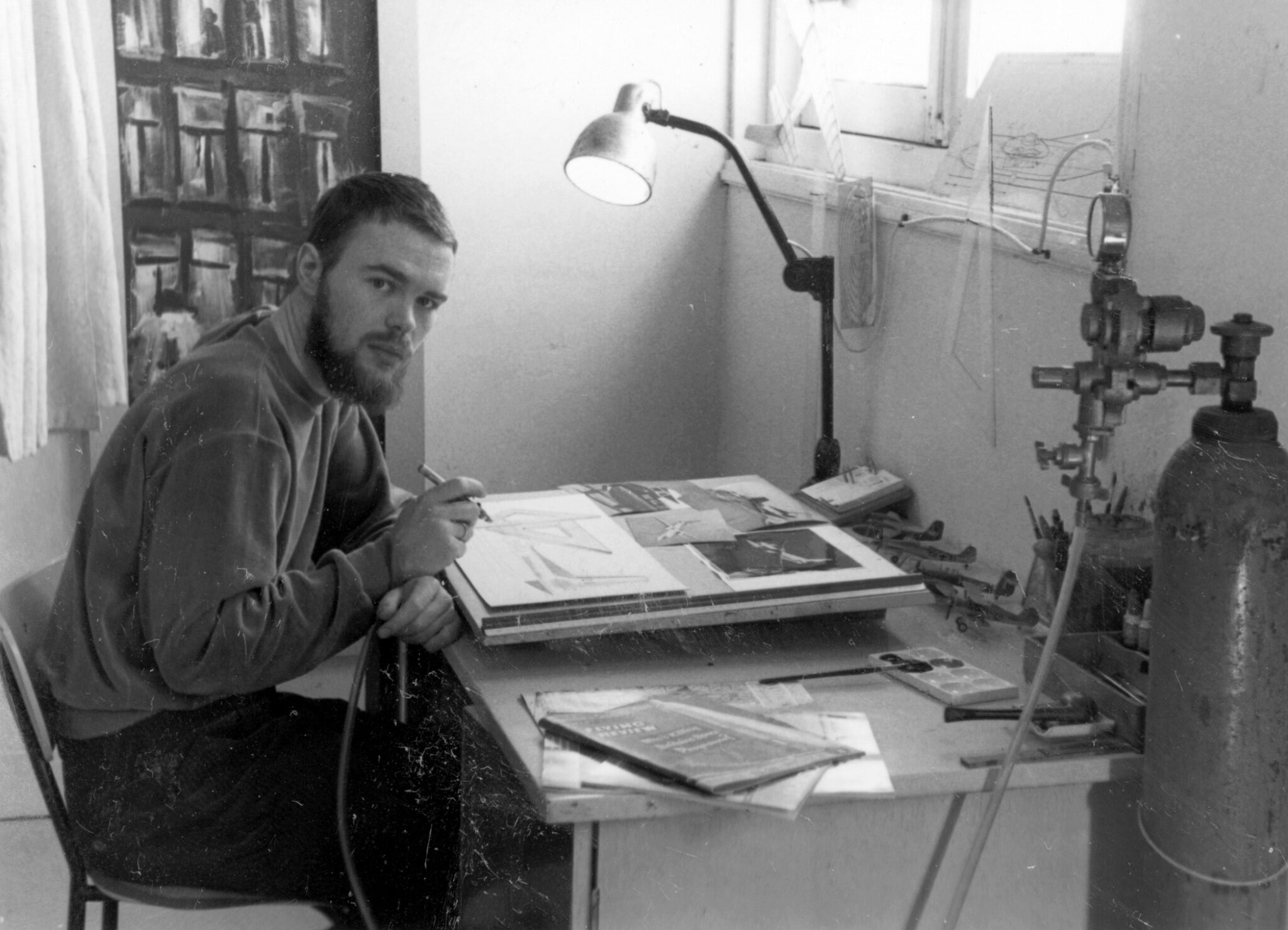 Schilderen doet hij ook boven. Op een bureaublad ligt een gouache in wording. ‘Aan de hand van foto’s, boeken en tijdschriften uit mijn archief begin ik heel dunnetjes met een potloodschets’, legt de kunstenaar uit. ‘Ik gebruik heel zwaar aquarelpapier, achthonderd gram. Heb ik de schets goed bevonden, dan detailleer ik hem en maak ik de definitieve potloodtekening van het vliegtuig. Daarna ga ik hem inkrassen, ingraveren. Vervolgens snijd ik een masker van zelfklevend doorzichtig folie om de afbeelding van het vliegtuig te beschermen. Alle kleuren die ik ga gebruiken staan al aangemaakt klaar als ik met een grote grove kwast het papier kletsnat maak in de basiskleuren. Is het eenmaal goed ingekleurd dan schilder ik met een grove kwast de basis, waarbij ik er steeds een ander kleurtje uitpik. De basis moet in vijf minuten klaar zijn.’