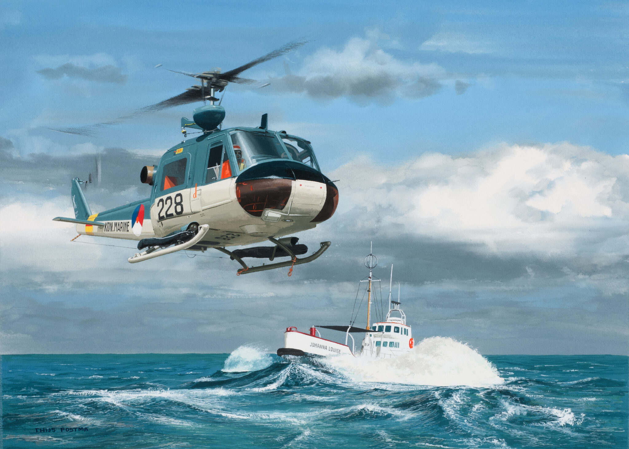 Alhoewel Thijs door de jaren heen honderden vliegtuigen heeft geschilderd, zowel civiel als militair, bleven uitstapjes naar andere onderwerpen niet uit. Helikopters, treinen, schepen, vrachtwagens, auto’s, motoren, portretten en landschappen, bedenk het maar. Nee, geen luchtballonnen. ‘Daarnaar is nooit vraag geweest’, zegt hij. ‘En zelf heb ik er geen echte interesse in, aan de vorm valt weinig eer te behalen.’