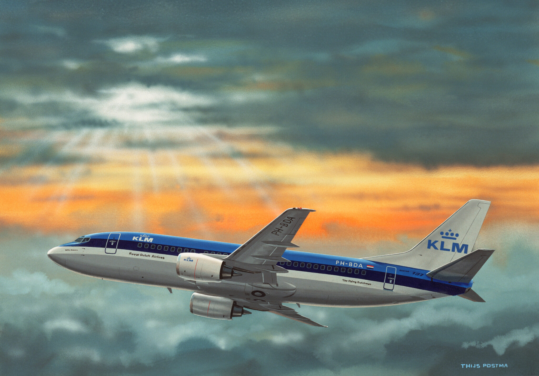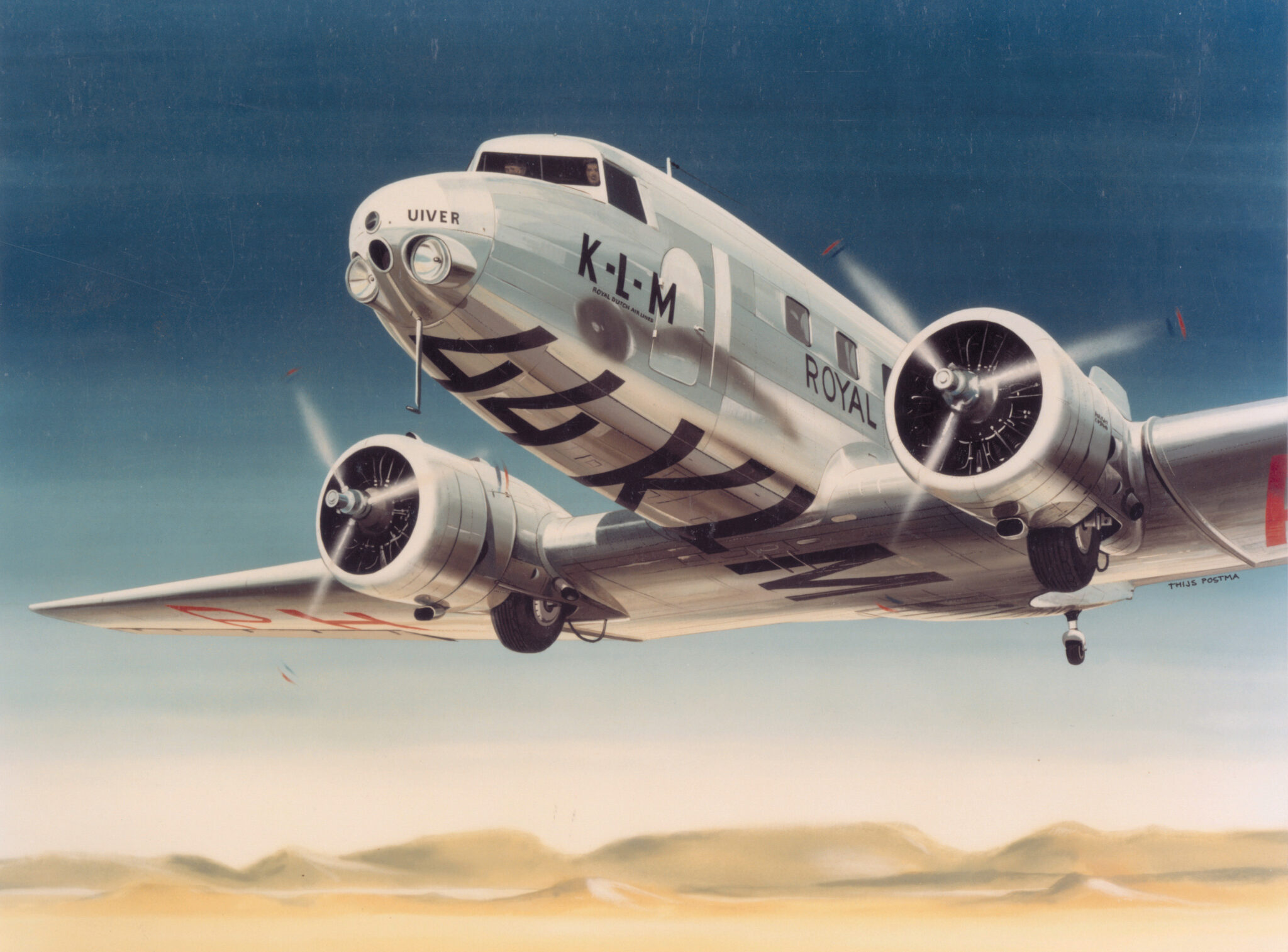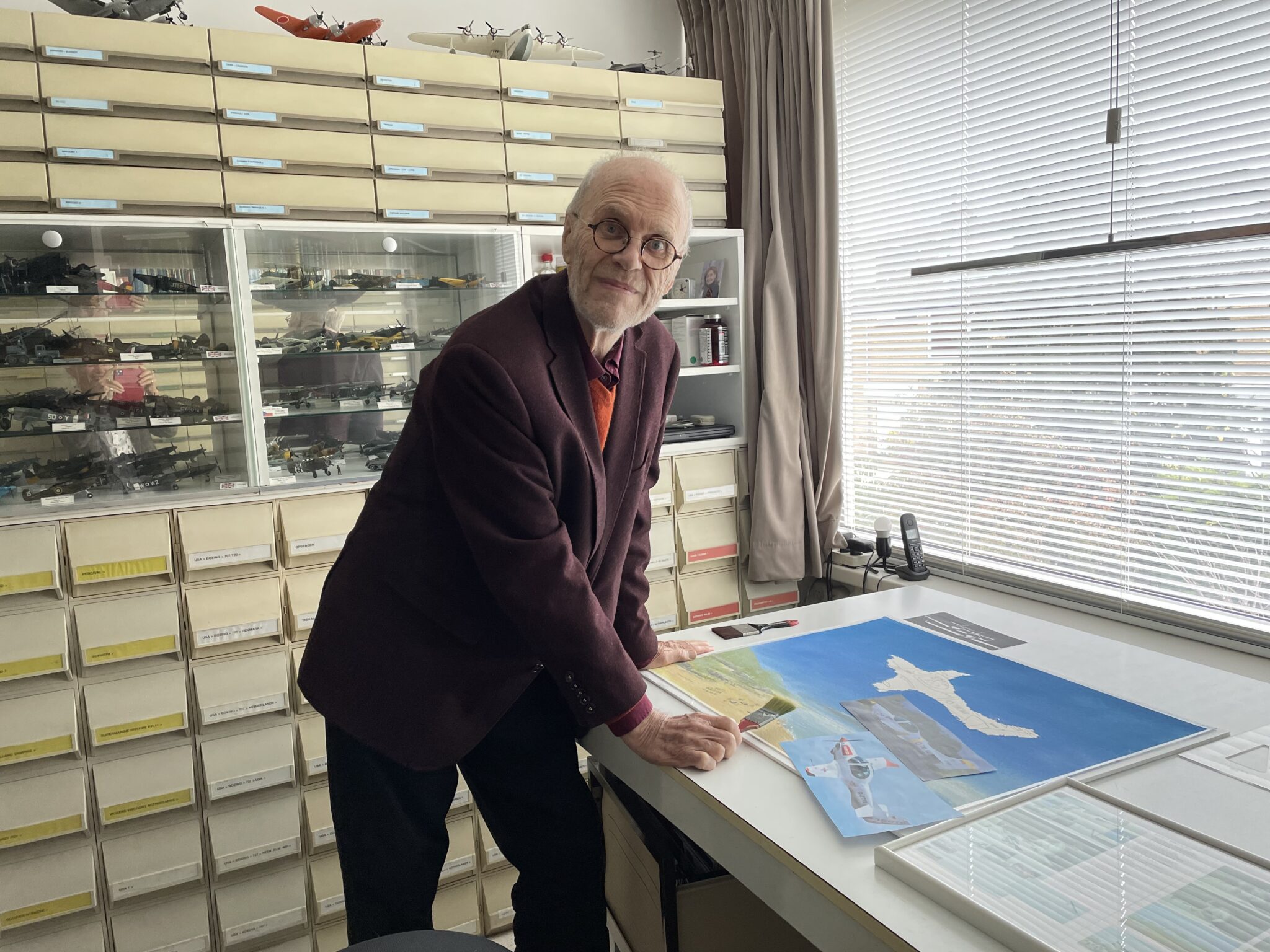 Vanwege haar zestigjarige bestaan liet Transavia een van haar fonkelnieuwe Airbus A321neo’s voorzien van een prachtig retro-jasje, geheel naar het ontwerp van Thijs Postma dat hij zestig jaar geleden maakte. De inmiddels 92-jarige kunstschilder, auteur en luchtvaarthistoricus, is niet alleen nog altijd in de weer met potloden, penselen en verf, ook het schrijven van artikelen blijft hem bezighouden evenals het bijhouden van zijn luchtvaartarchief. ‘Ik ben bezeten van vliegtuigen’, zegt hij. Dat is te zien in iedere hoek van het huis waarin hij samen met zijn vrouw Sylvia woont.