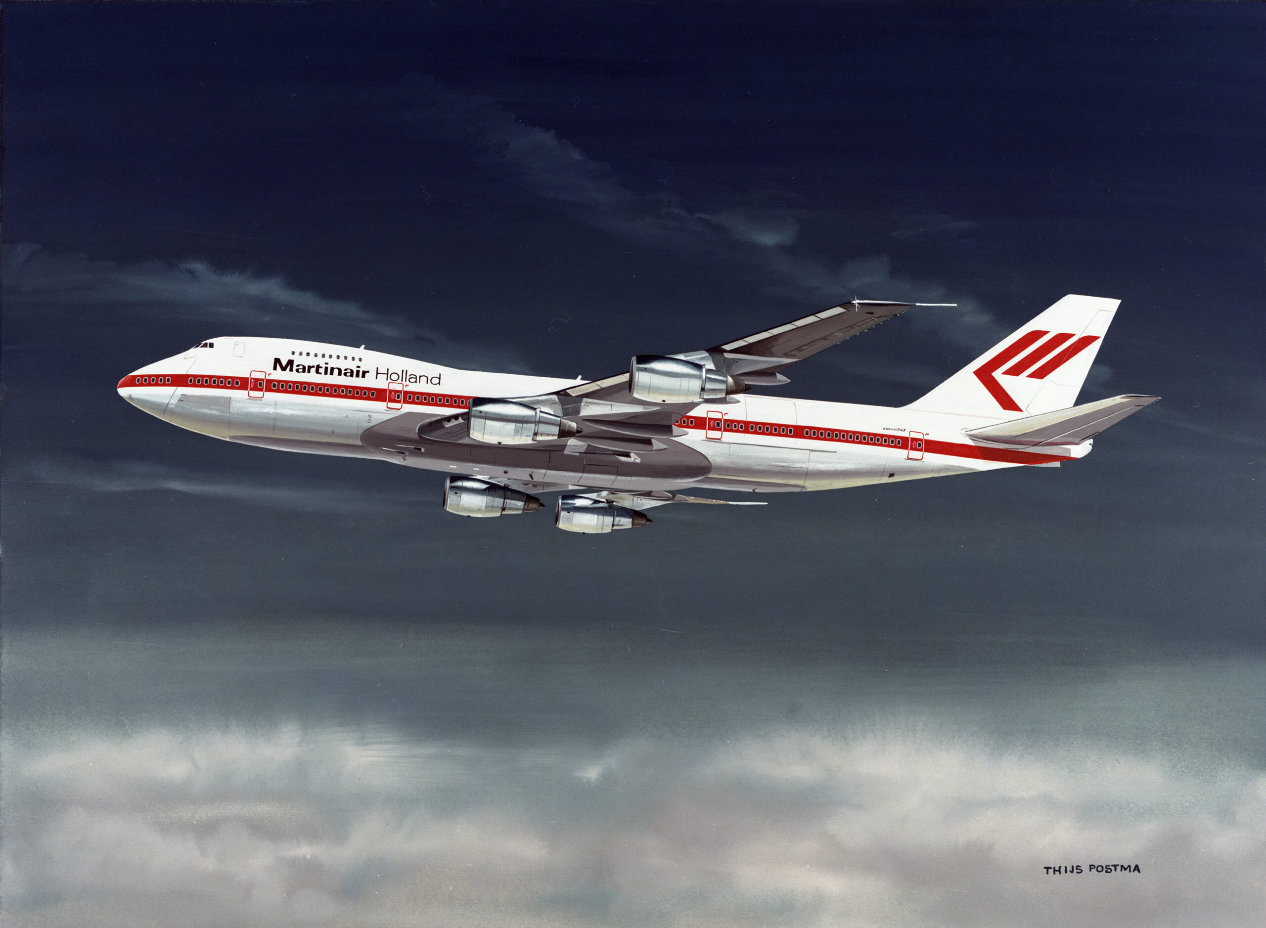 Nadat hij in 1960 zijn eerste recensie had gekregen in het door Hugo Hooftman uitgegeven blad Cockpit, zette Thijs een stap richting Martin’s Air Charter met het voorstel folders te maken voor de rondvluchten die de kersverse airline vanaf Schiphol boven Amsterdam uitvoerde. ‘Nog datzelfde jaar vroeg Martin Schröder mij of ik voor zijn Dakota een beschildering wilde ontwerpen. Ik koos een kleurencombinatie met rood en blauw, op dat moment nog zeer ongebruikelijk in de luchtvaartwereld. Schröder was enthousiast en de opdracht volgde om de complete huisstijl voor de MAC te ontwerpen.’