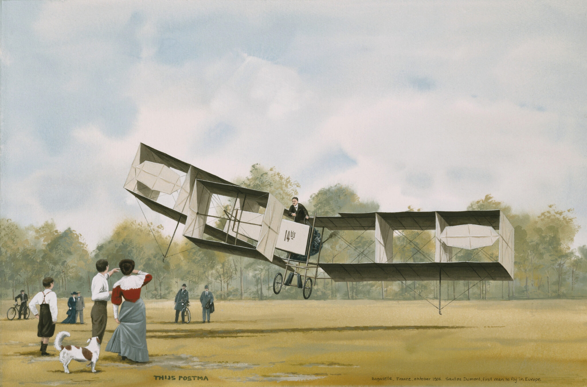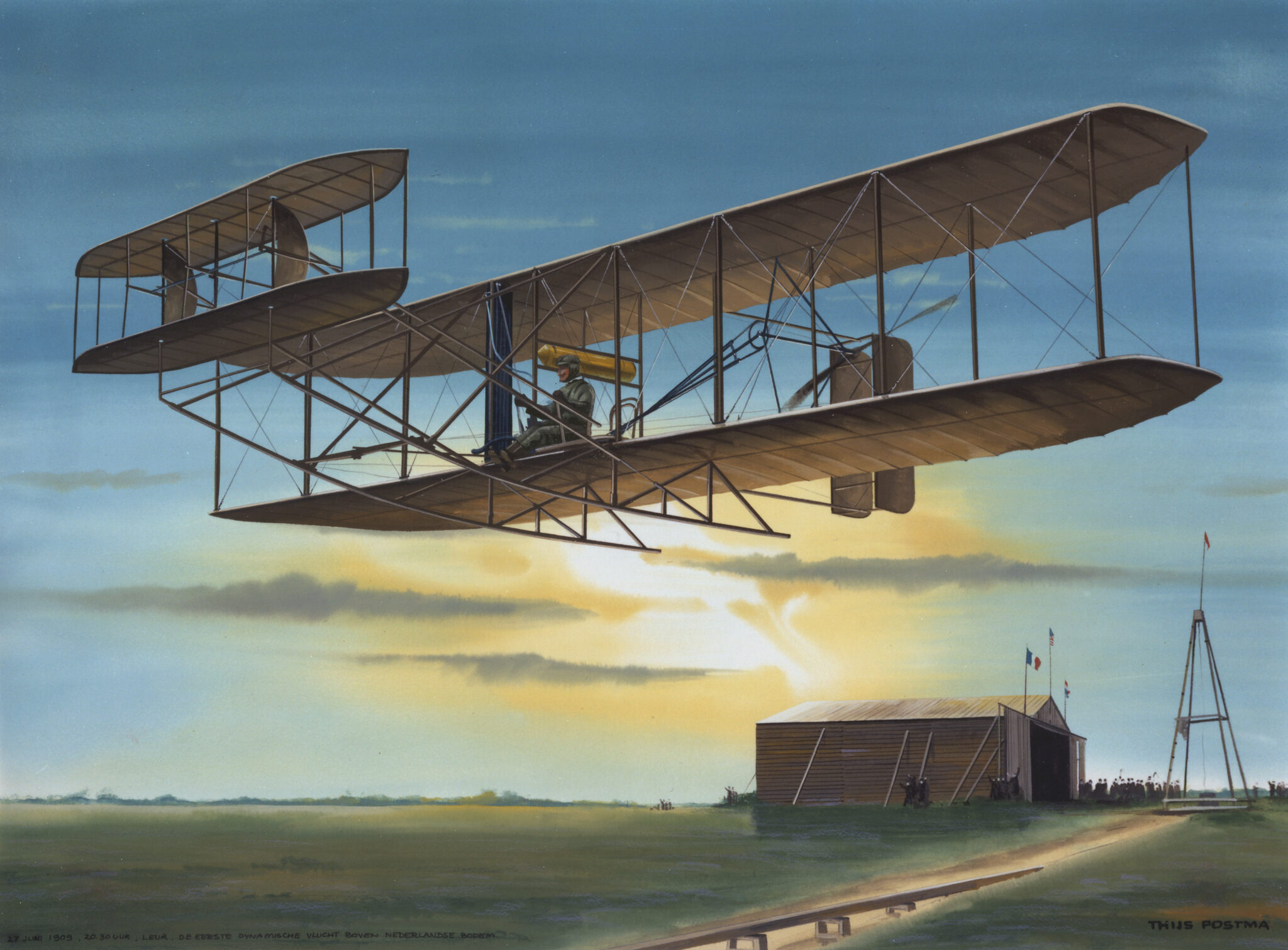 ‘Toen de oorlog voorbij was stonden er enige tijd geallieerde vliegtuigen op de Dam. Mijn enthousiasme voor de luchtvaart werd daardoor beslist aangewakkerd’, vervolgt Thijs. ‘Op de Dam was ik ook dikwijls in de weekends te vinden met een schoolbord en kleurkrijtjes. Dat bord hing ik met een touwtje op aan een lantaarnpaal. Ik tekende landschapjes, terwijl een vriendje met de pet rondging. De meeste mensen gooiden daar een cent in, een enkeling een dubbeltje. Dat was in die tijd heel veel geld. Er was zelfs een mijnheer die er een gulden in gooide en aan mijn vriendje vroeg of ik Thijs Postma was. Dat was het weerzien met mijn vader, die ik sinds de scheiding van mijn ouders in het begin van de oorlog niet meer had gezien.’