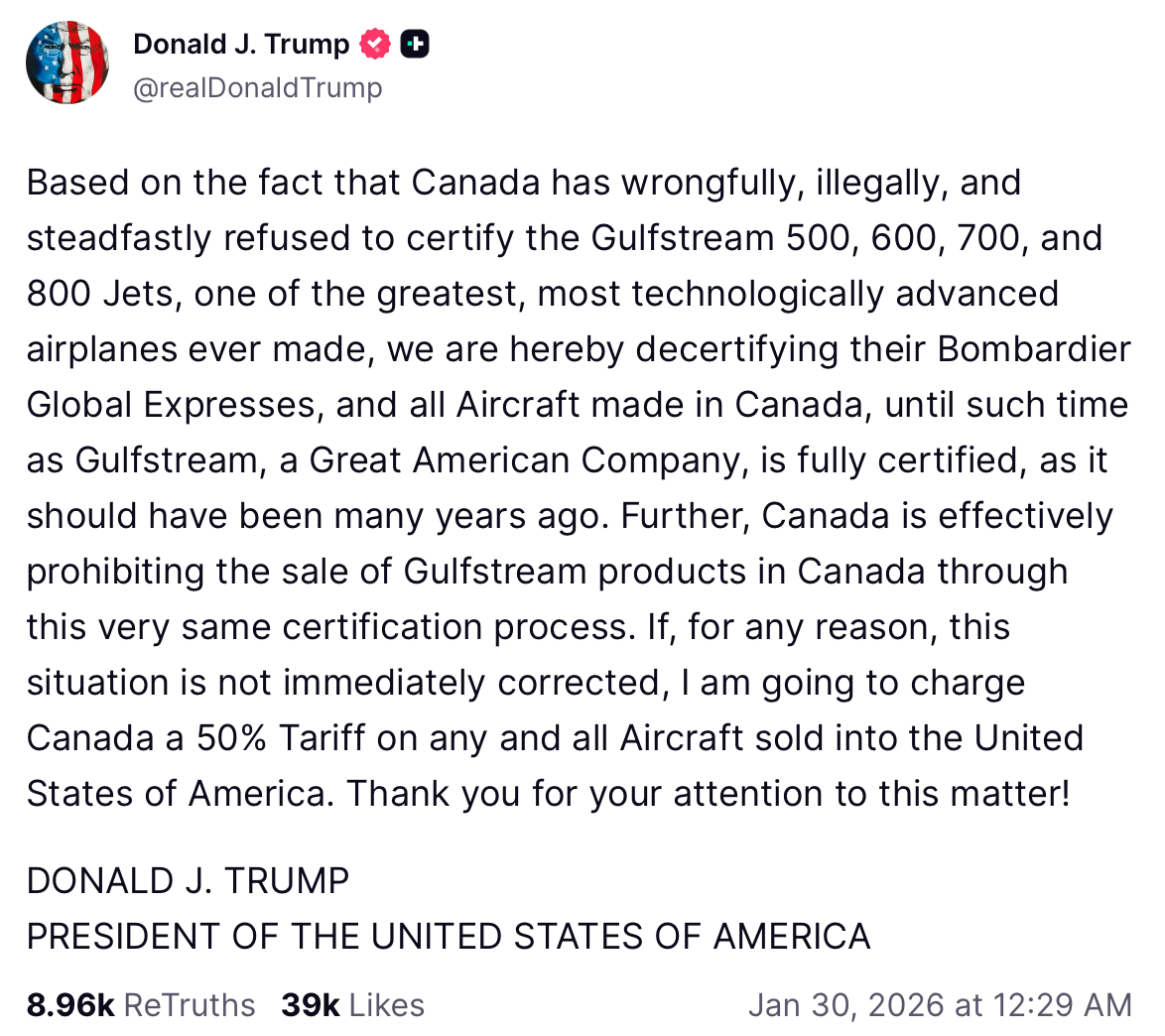In zijn post schrijft Trump daarom dat hij de Canadese Bombardier Global Express-vliegtuigen ‘en alle vliegtuigen die in Canada gemaakt zijn’ wil decertificeren, totdat de Gulfstreams ook in Canada verkocht mogen worden. Daarnaast dreigt Trump met de invoering van een handelstarief van 50 procent op alle -vermoedelijk Canadese- vliegtuigen die in de VS verkocht worden, als het land de huidige situatie niet snel wordt opgelost.